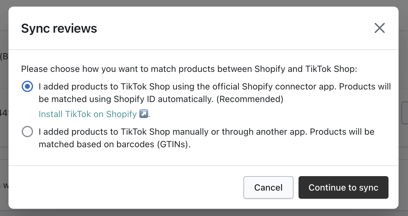Choose the correct product-matching method (Shopify's TikTok connector app or manual product upload). Ensure you choose the right one since reviews cannot be re-synced once sent to Tiktok Shop. Then click Continue to sync.