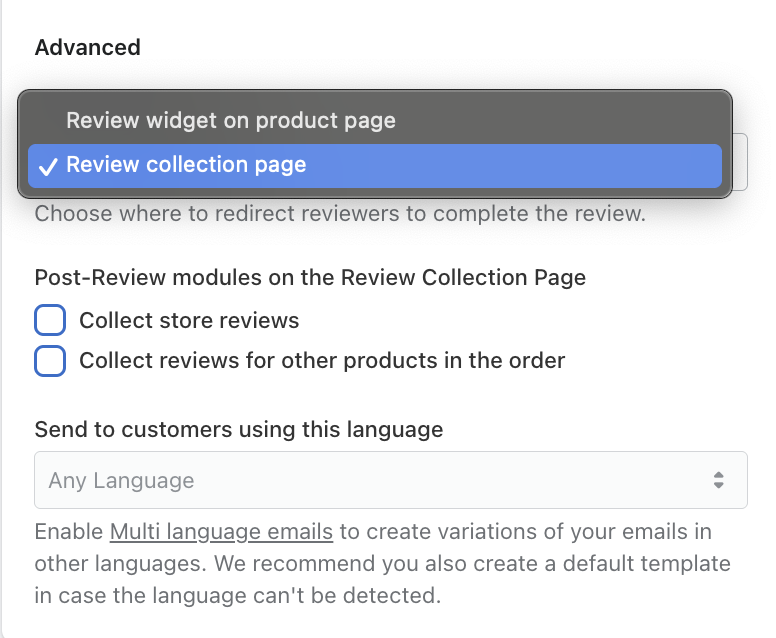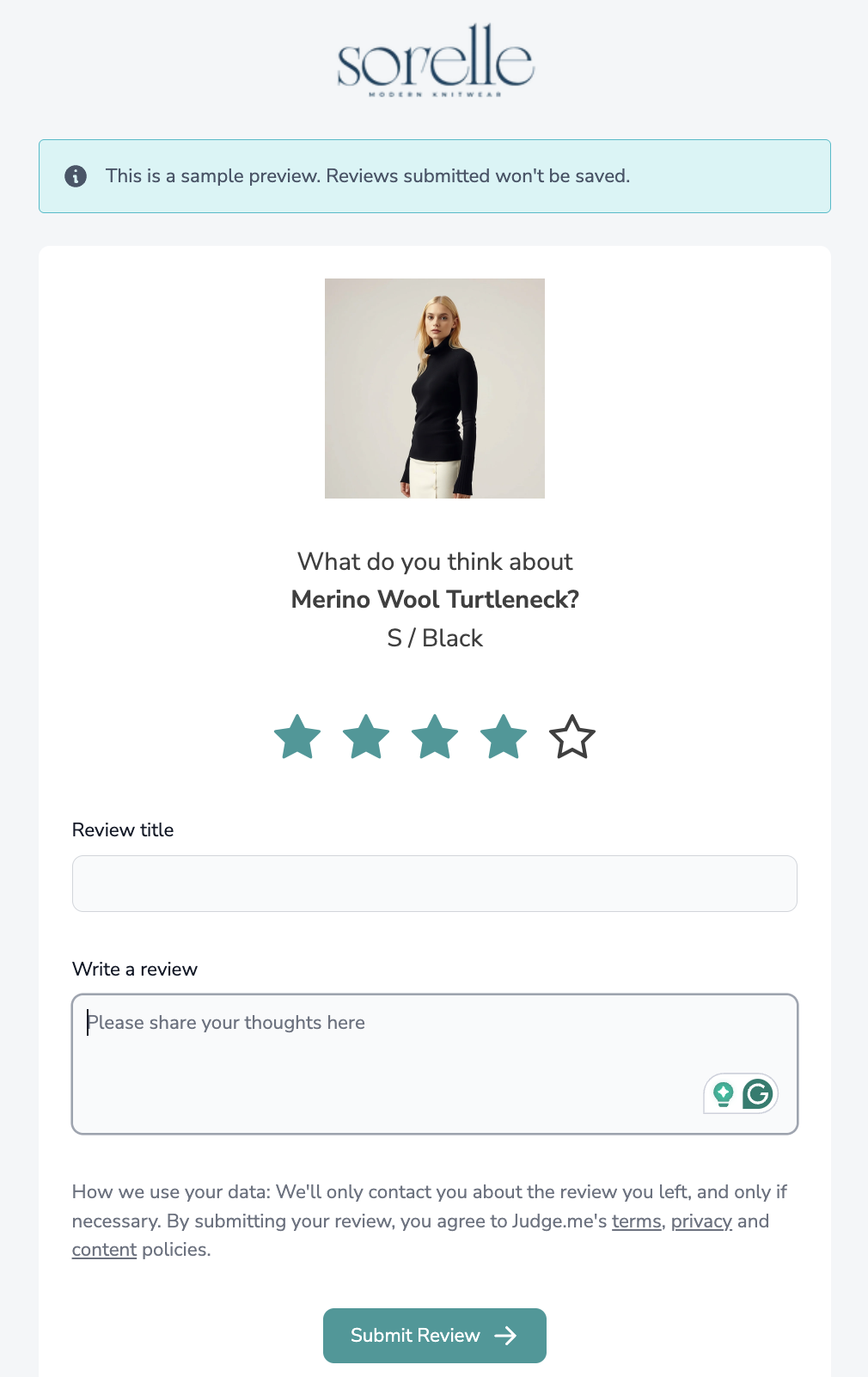 The review collection page is a hosted page where customers submit their reviews after clicking on a star rating in your email. It’s enabled by default for all new templates.