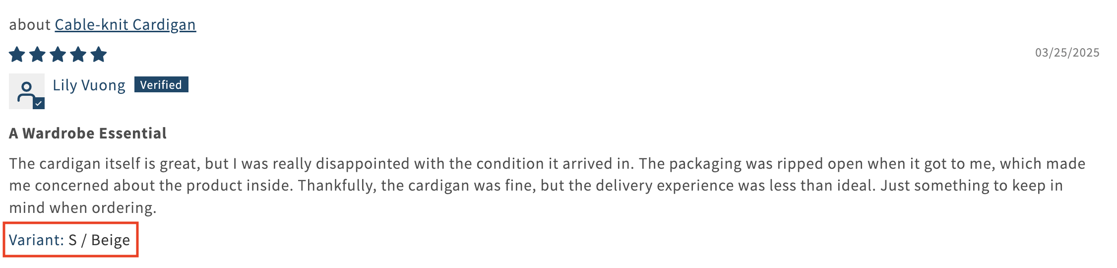 Example: A customer purchases a blue T-shirt in size M. Their review request email specifies the variant (blue, size M) and includes an image of the exact product. When they submit their review, future customers browsing the product page will clearly see that the feedback applies to the blue, size M variant, helping them make an informed decision.