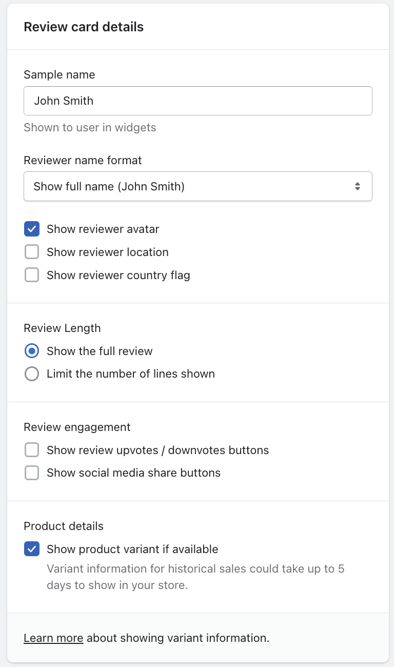 Note: Once this setting is enabled, it might take a few moments (up to 5 days) to backfill product variant information for historical reviews and display it in the widgets.