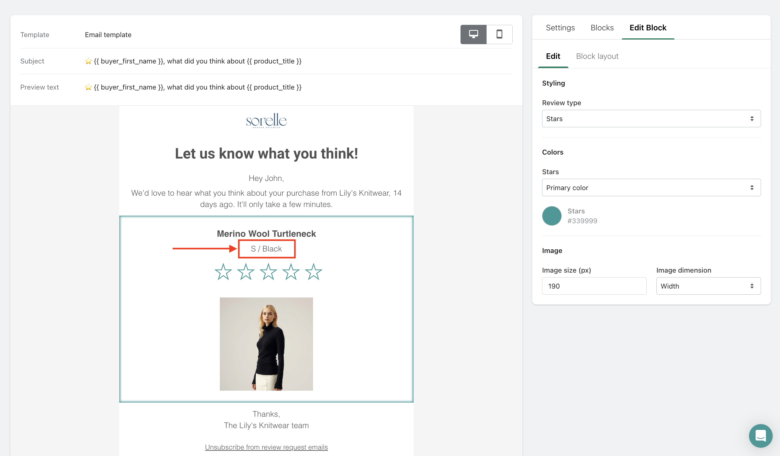 Product variant display is available only in the new email templates that use the Product Reviews block and on the review collection page. The new templates and the review collection page are enabled by default when you install the app.
