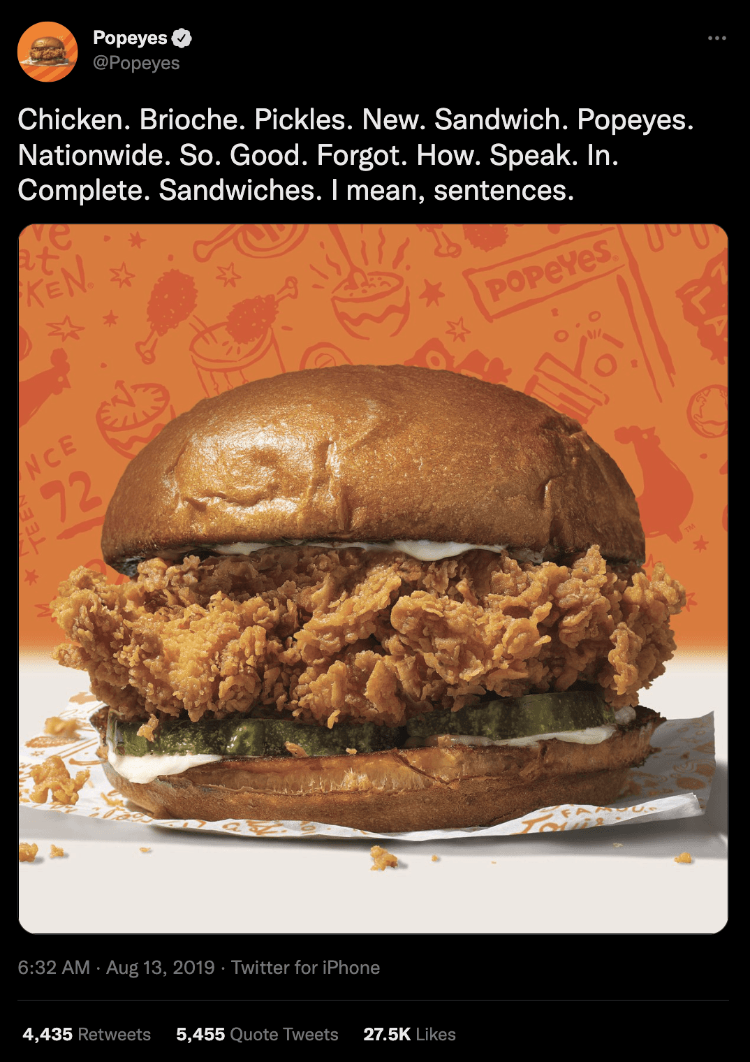 An excellent example of a brand that uses this strategy is Chick-fil-A. A few years back, Popeyes posted a tweet announcing its new product:
