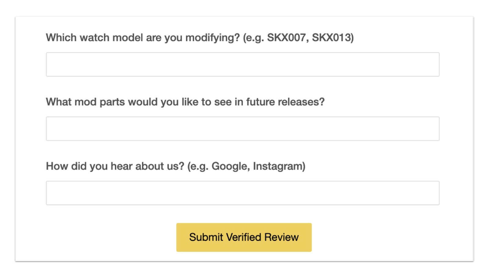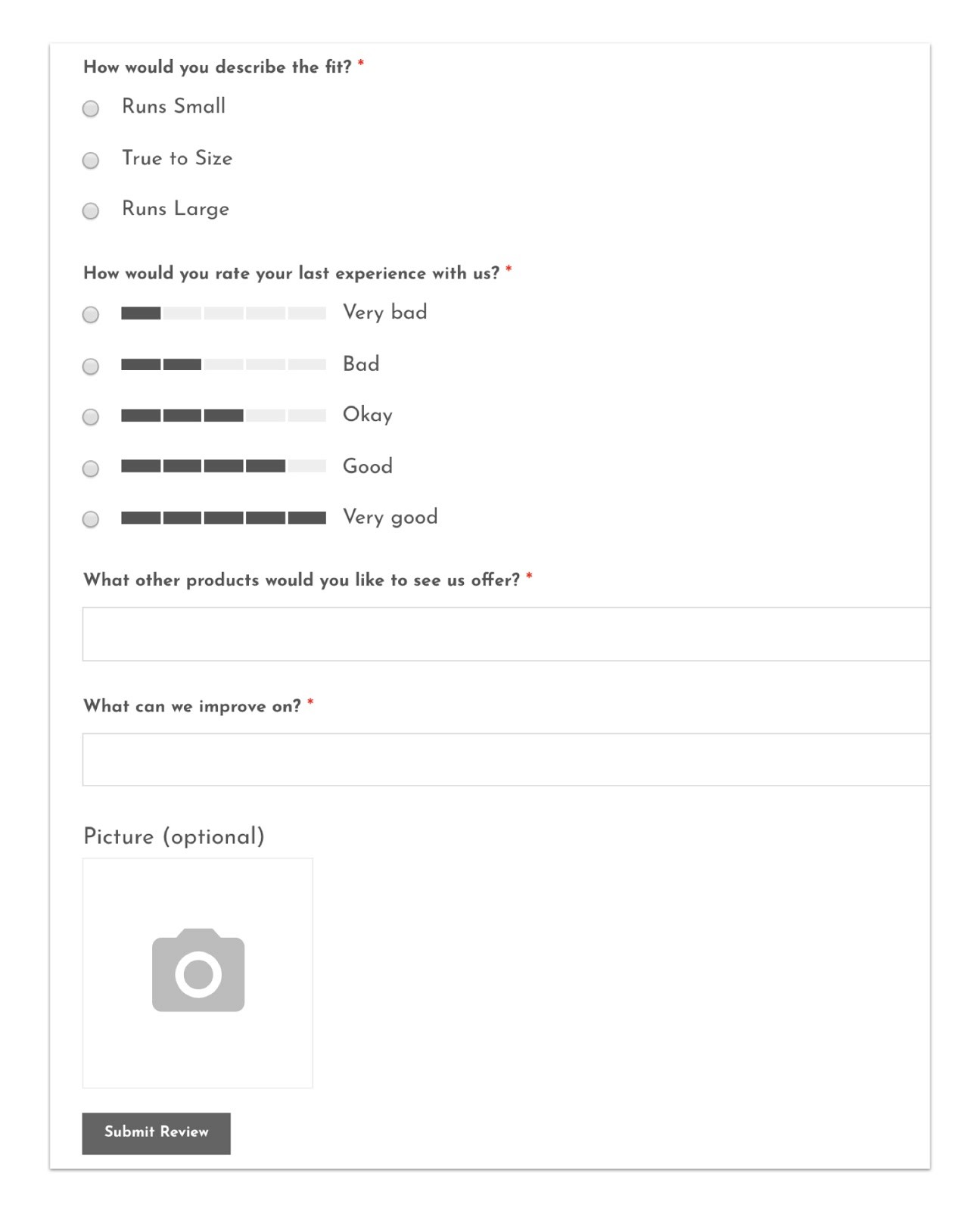 Our Custom Forms feature (on Judge.me’s Awesome plan) lets you add a set of custom questions to your Review Widget and review request emails. Your customers can submit their answers along with the star ratings and reviews. You can display these answers on your Review Widget or keep them internally.