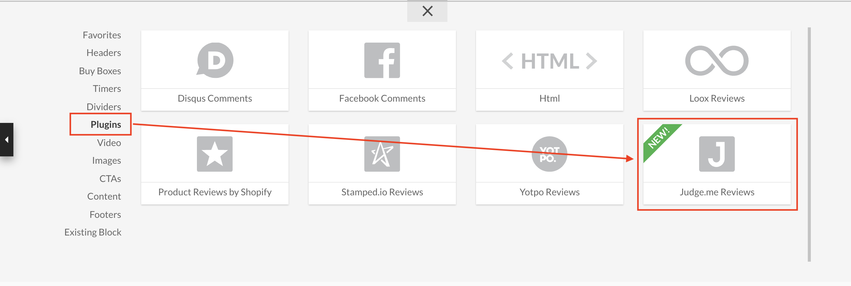 From the list of blocks, select "Plugins," then "Judge.me Reviews."