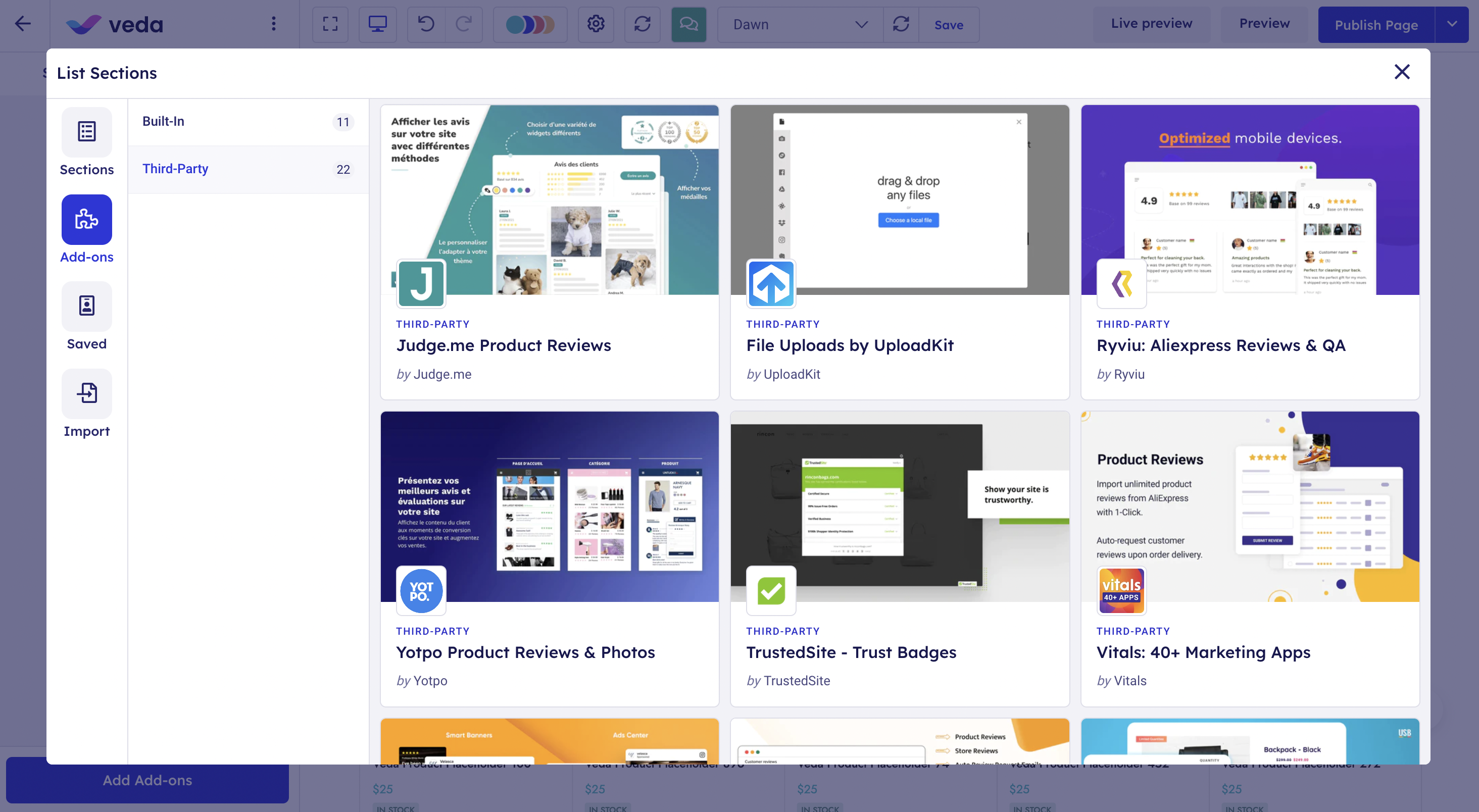Veda Builder offers a user-friendly drag-n-drop editor, an extensive library of page and section templates, SEO-friendly features, and built-in add-ons, making it to create high-converting pages. With the integration of Judge.me with Veda, you can now easily install Judge.me widgets using the Veda drag and drop editor.