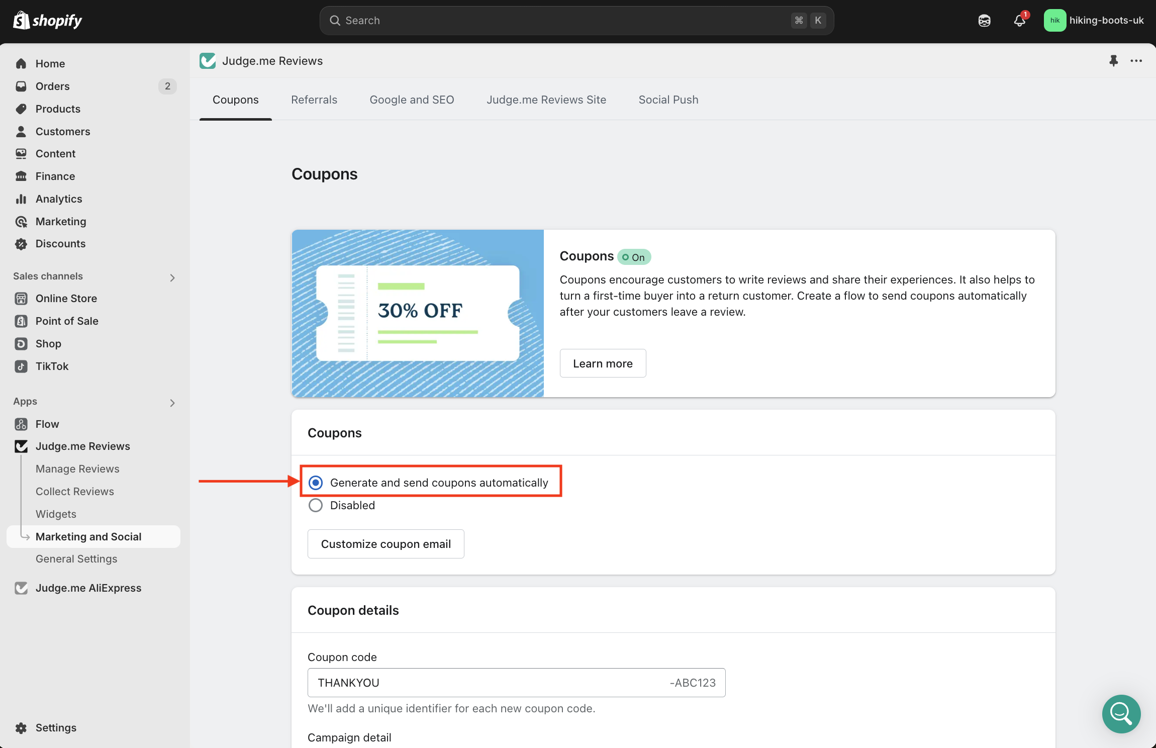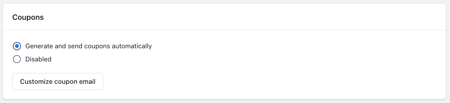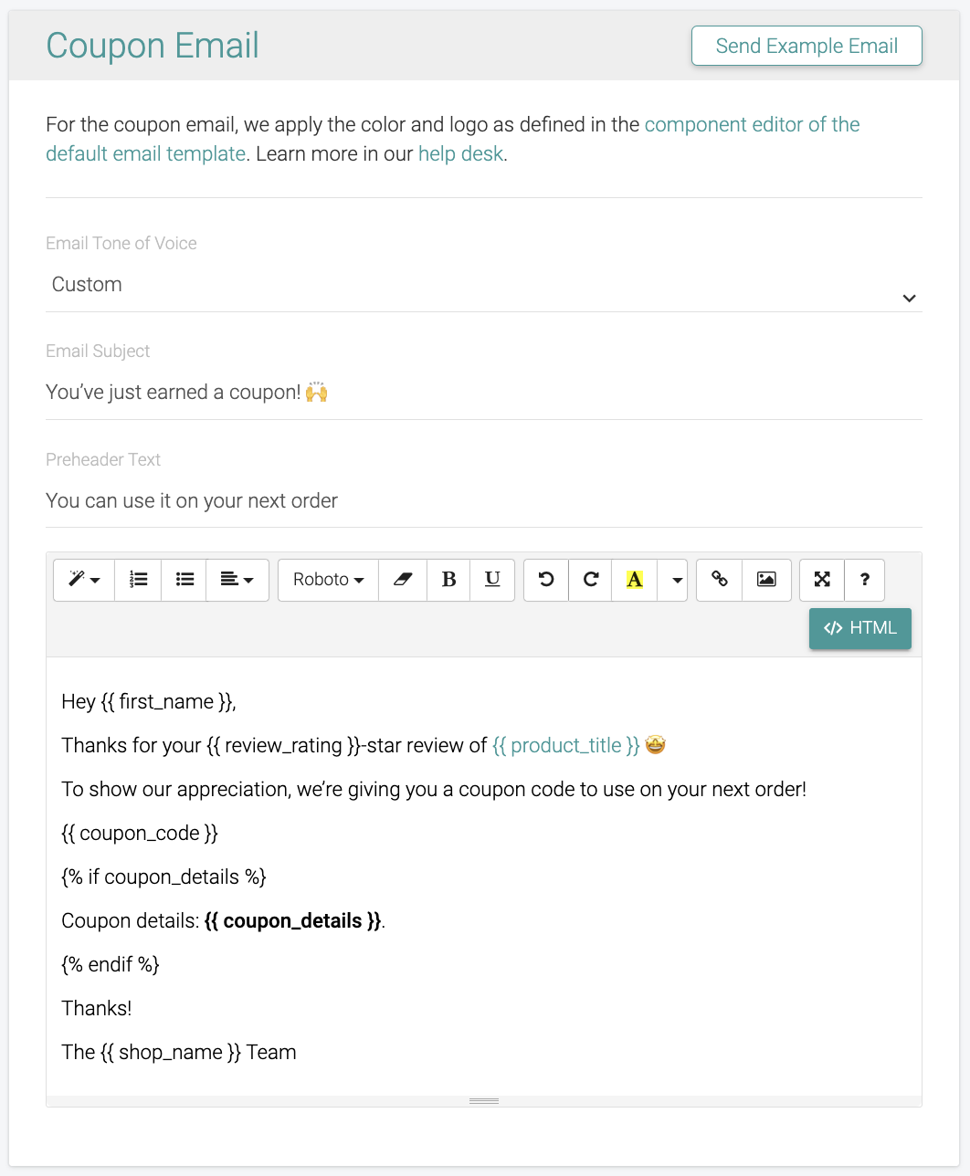 When all reward conditions are met, the reviewer will receive the coupon code via email. To personalize this email, go to the Coupons section and click Customize coupon email.