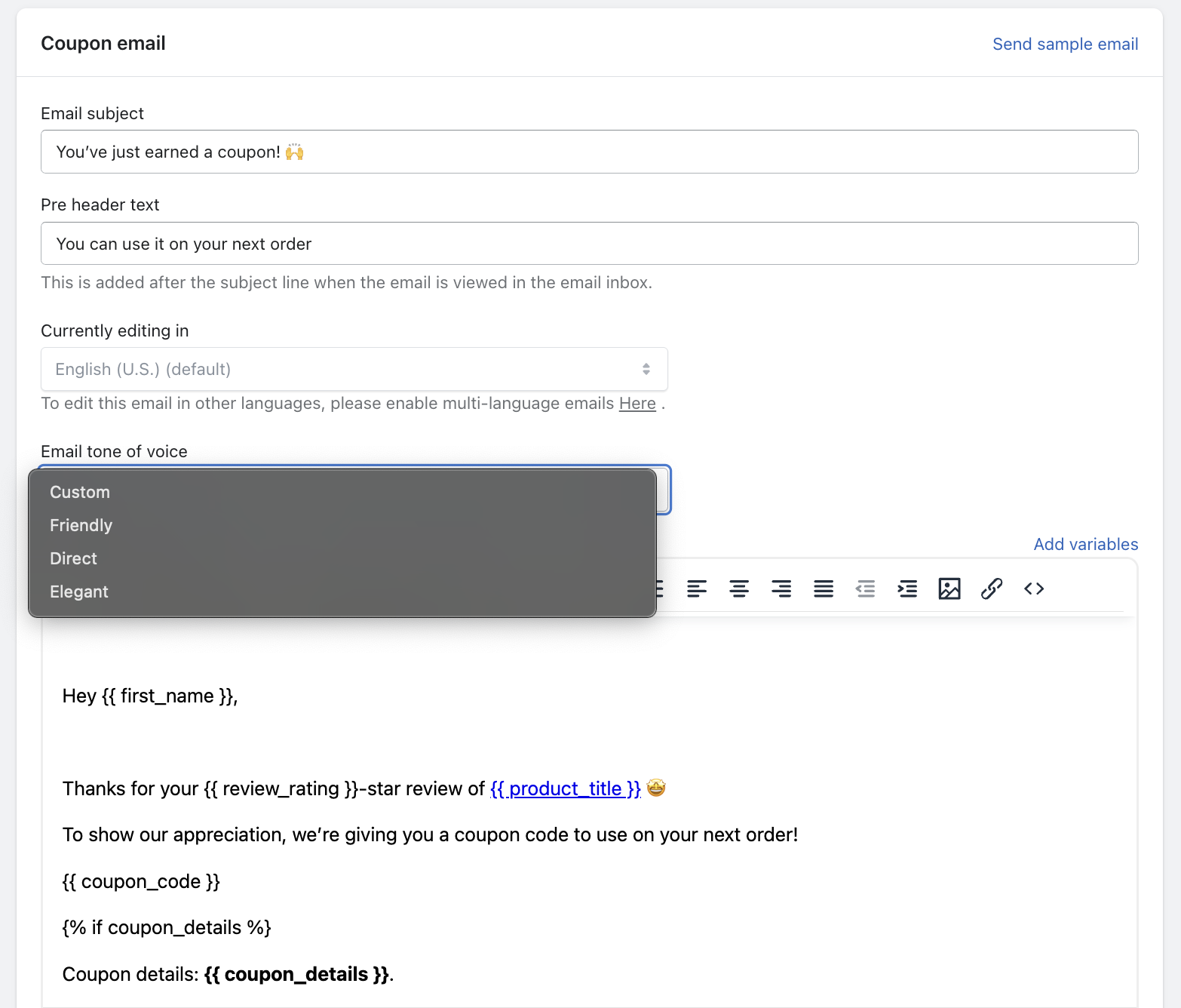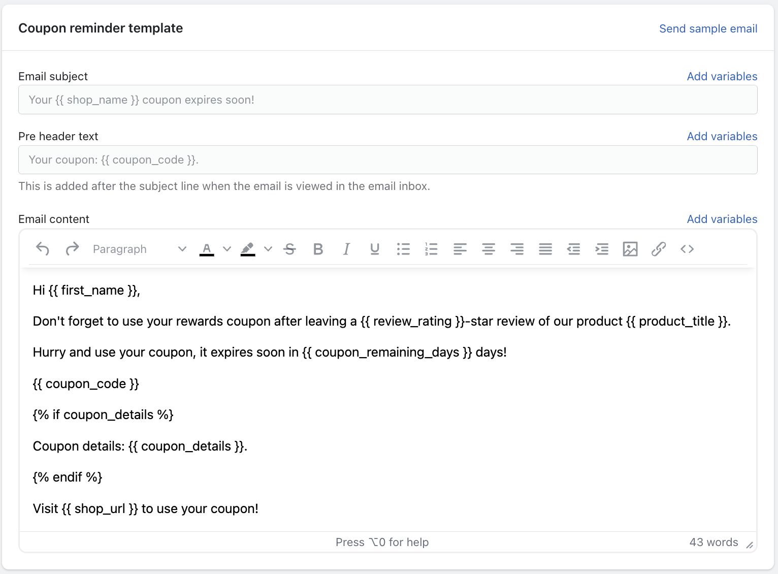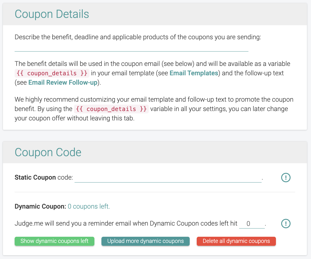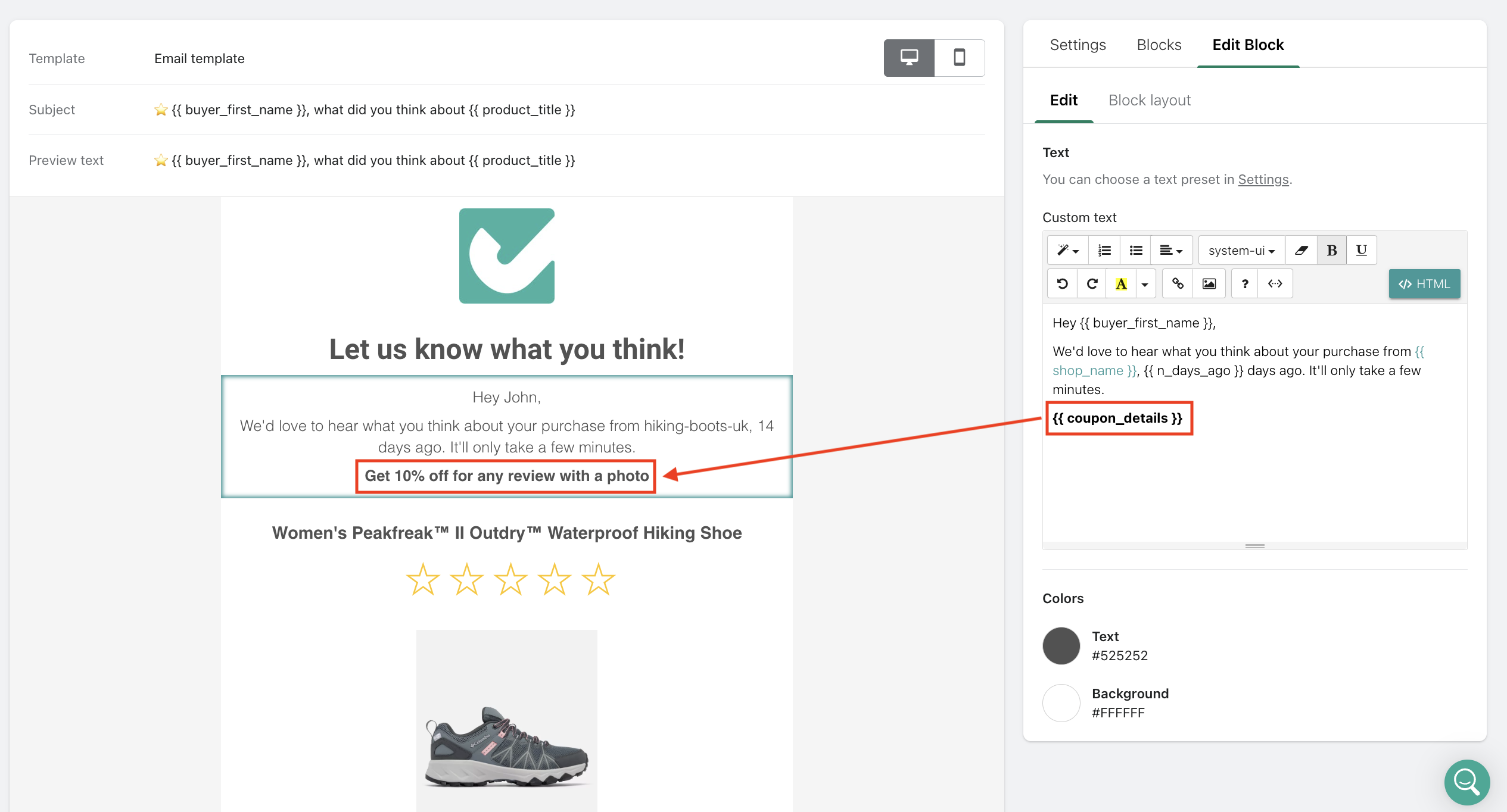 Once your coupon is set up, you can promote it in your review request emails by adding the variable {{ coupon_details }} to the email content. This will automatically display the campaign details you set in the Coupons section, encouraging more reviews.
