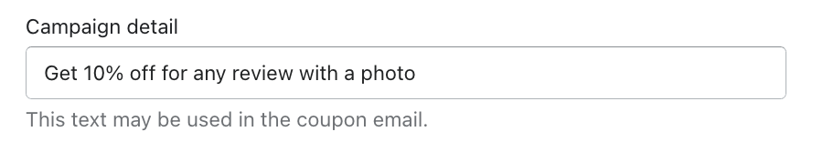 Campaign detail | A text to describe your coupon campaign. For example, Get a 10% discount if you submit a review with a photo. |