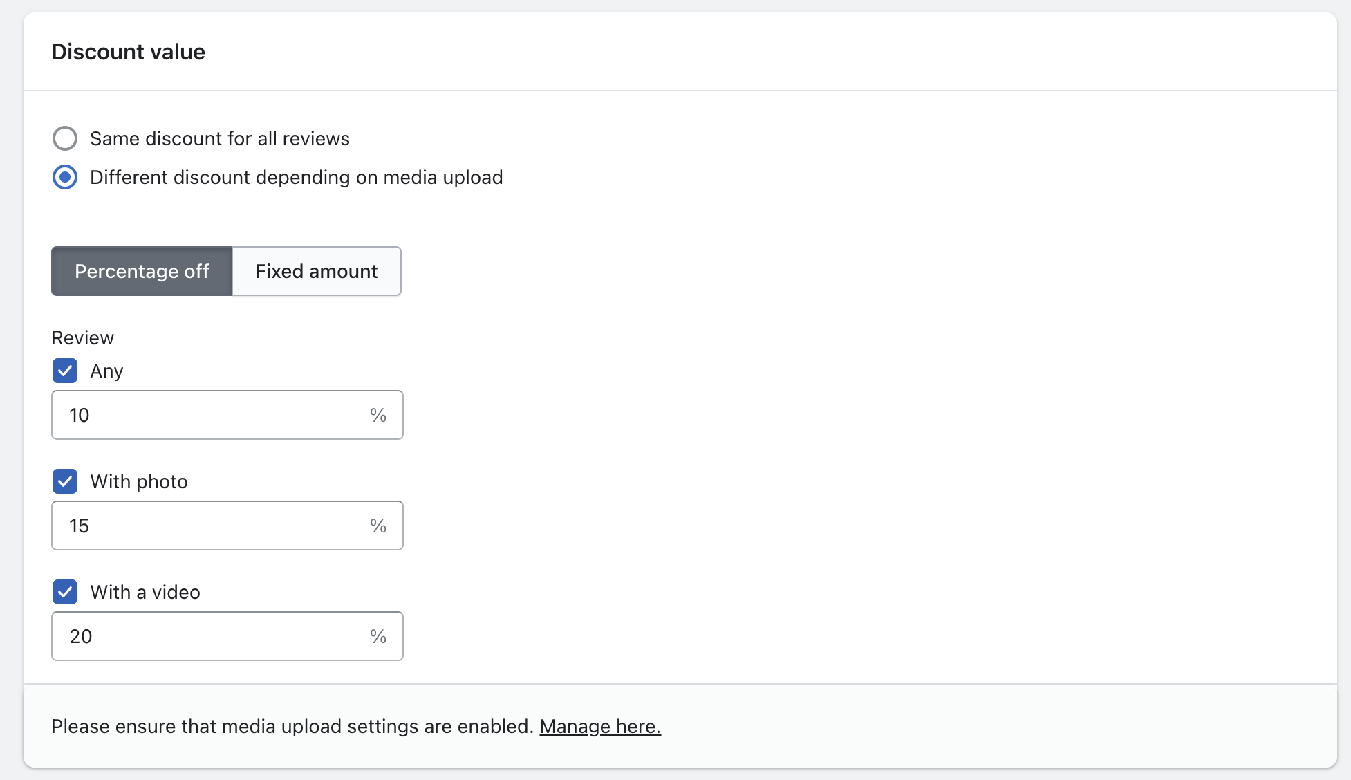 Note: When using multi-tier coupon discounts, each higher tier must offer an equal or greater discount than the lower one. For example, the discount for "With video" must be the same or higher than the discount for "With photo." Also, make sure media upload settings are turned on for this to work properly.