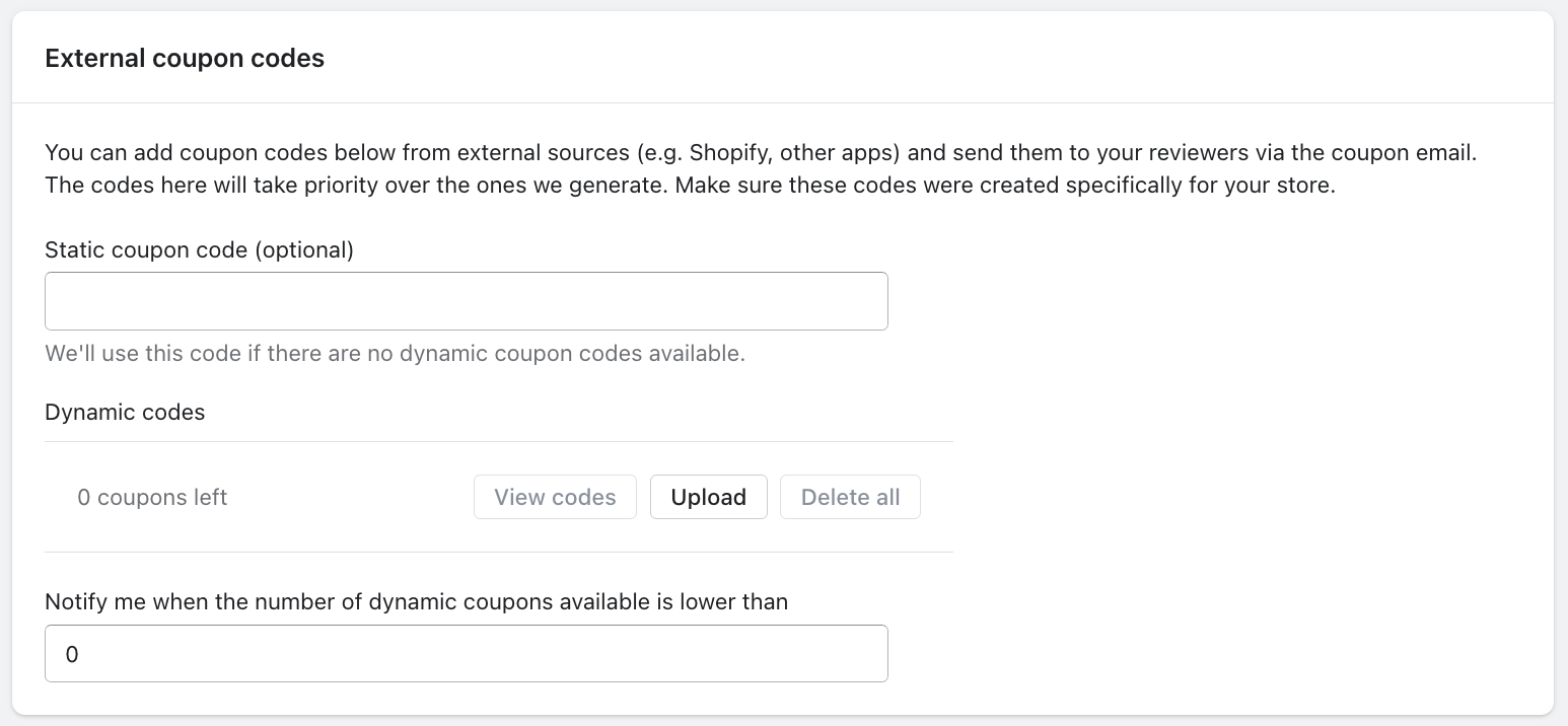 If you have coupon codes from other sources, simply add them under External Coupon Codes, and weโll include them in Judge.meโs coupon emails to your reviewers. These external coupons will take priority over those generated by the reward conditions above. Learn more about how to use these coupons in this detailed article.