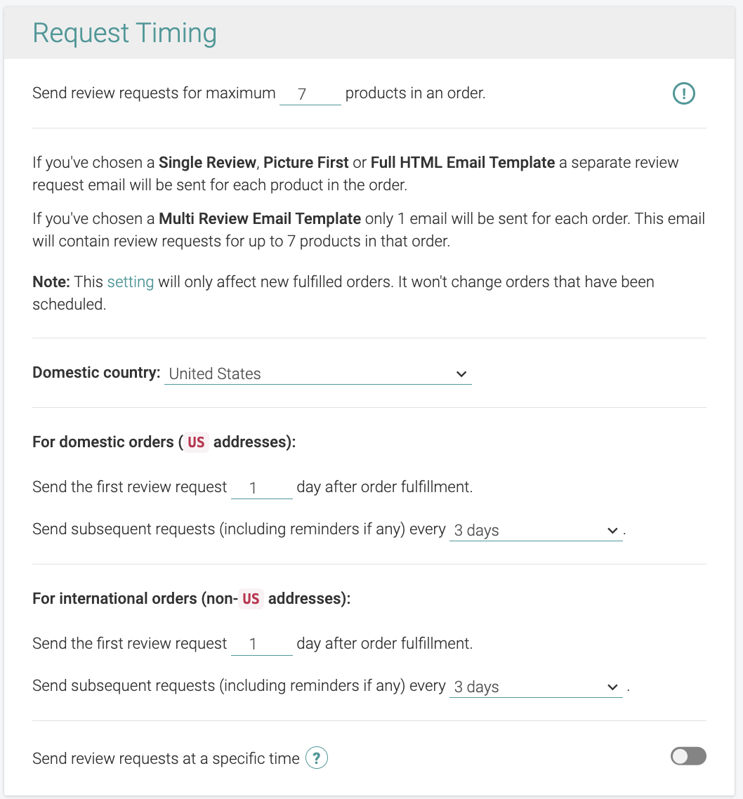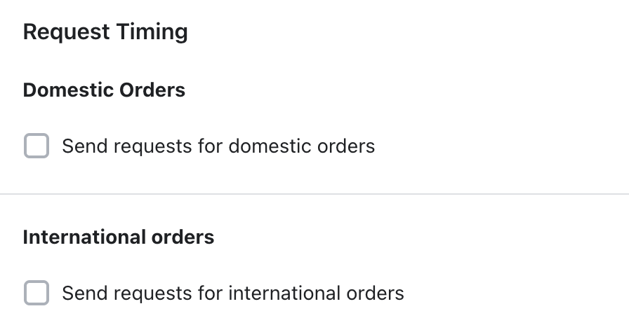 Under Request Timing, adjust the timing based on your needs, and even set different delays for domestic and international orders to match your shipping and delivery expectations.