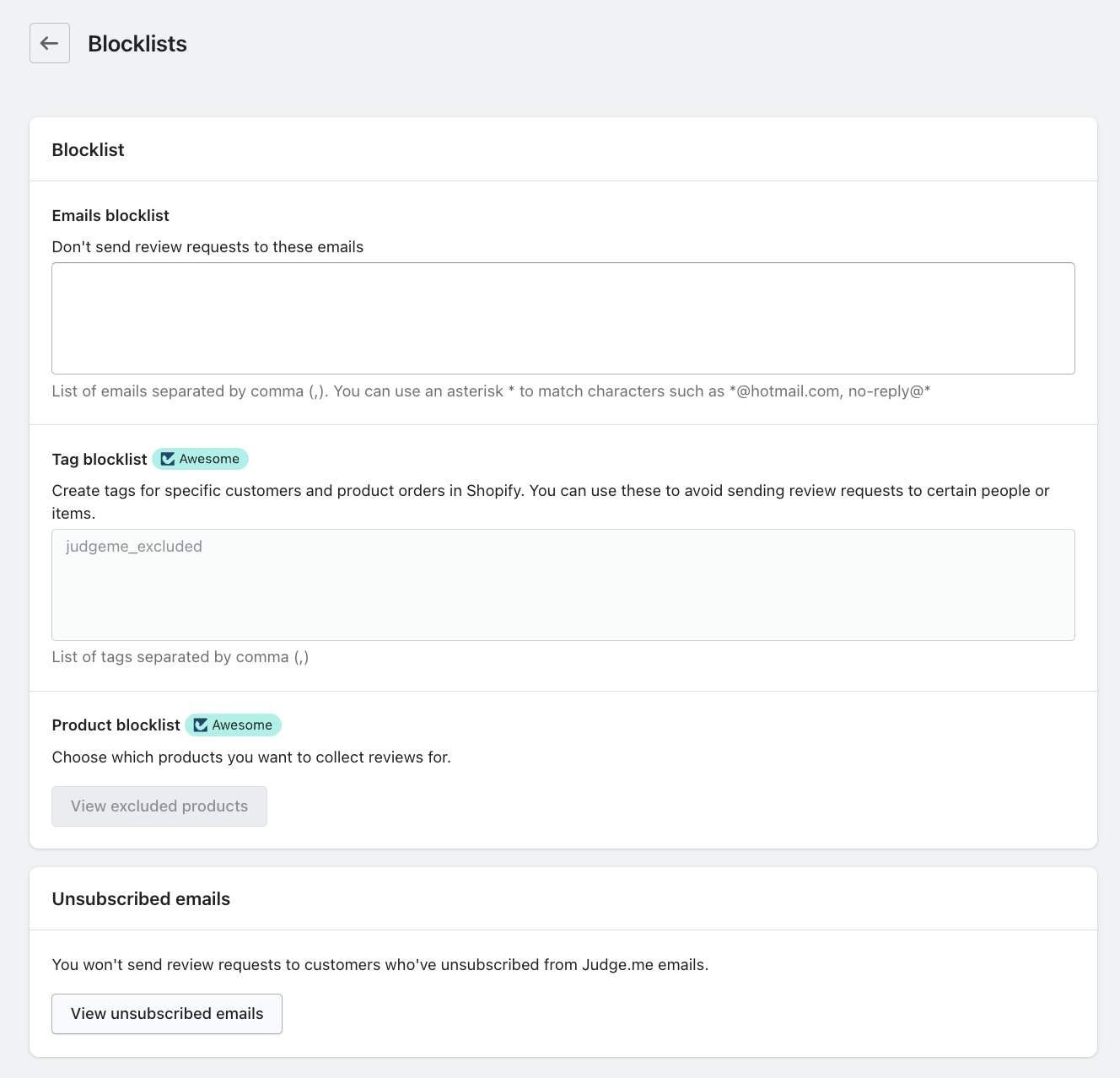 For Awesome Plan users, you can also block products, customers, and orders by adding tags. Read our guide on excluding products, customers and orders from review requests →