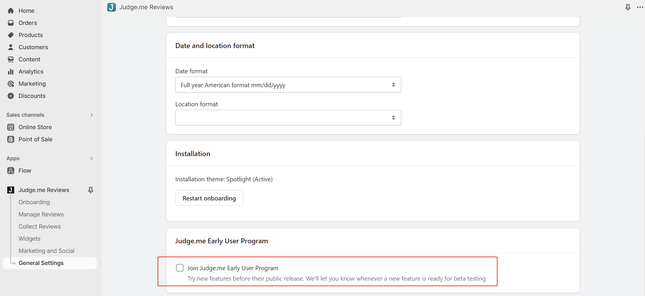 In the Judge.me Early User Program section, check the box to indicate your interest and participation.