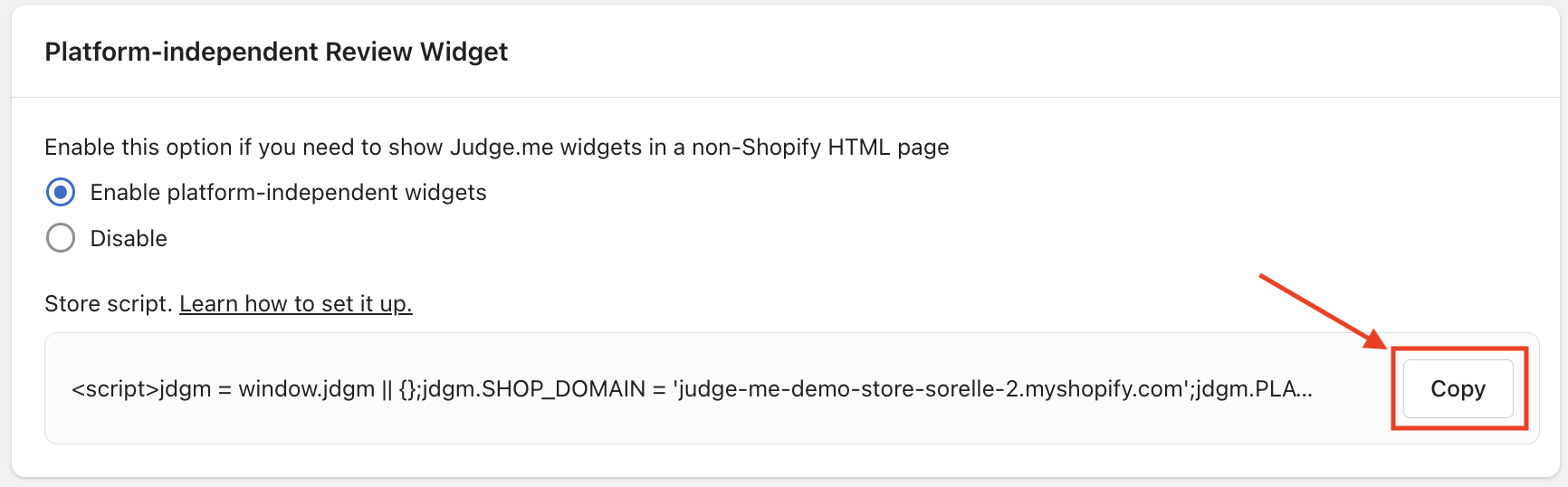 From your Judge.me admin, go to General Settings > Advanced > Platform-independent Review Widget.