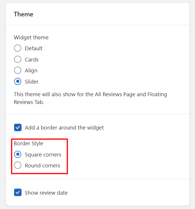 You can select the square or round corner for your Review Widget in Widgets > Review Widget > Manage > Border Style. This will be applied to widget containers, star rating bars, buttons, images, search input, etc.