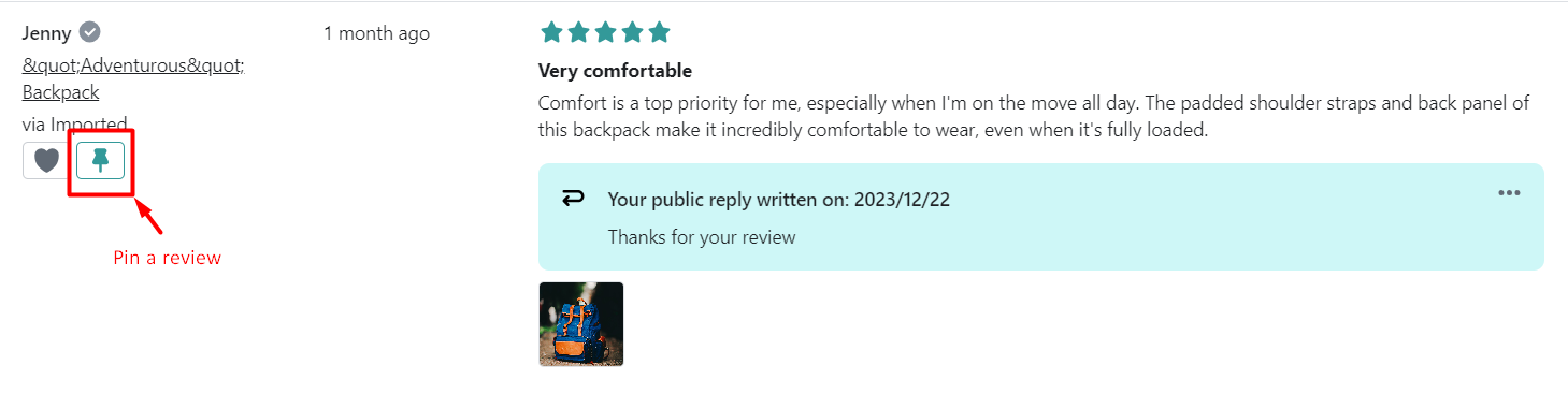 You can "pin" some specific reviews to always display them on top, regardless of the filters your customer may apply. To pin reviews, simply go to the Reviews dashboard (judge.me/index) and click on the "Pin" icon.