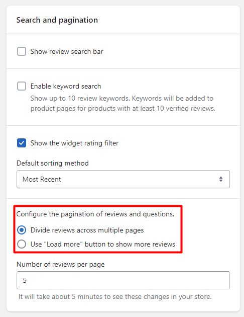 You can choose either standard pagination (1 2 3 4..) or a “Load More” button in SWidgets > Review Widget > Manage > Search and pagination. The "Load More" button will be either square or round depending on the border style setting. This feature is also available in existing Judge.me widgets (Widgets 2.0).