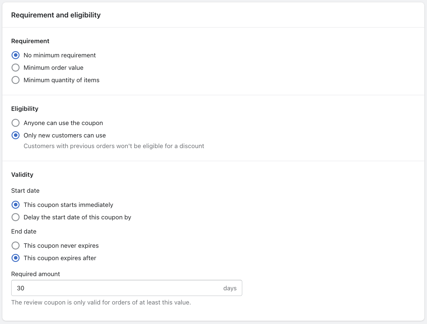 Validity: Starts immediately or after (x) days and never expires or expires after (x) days.