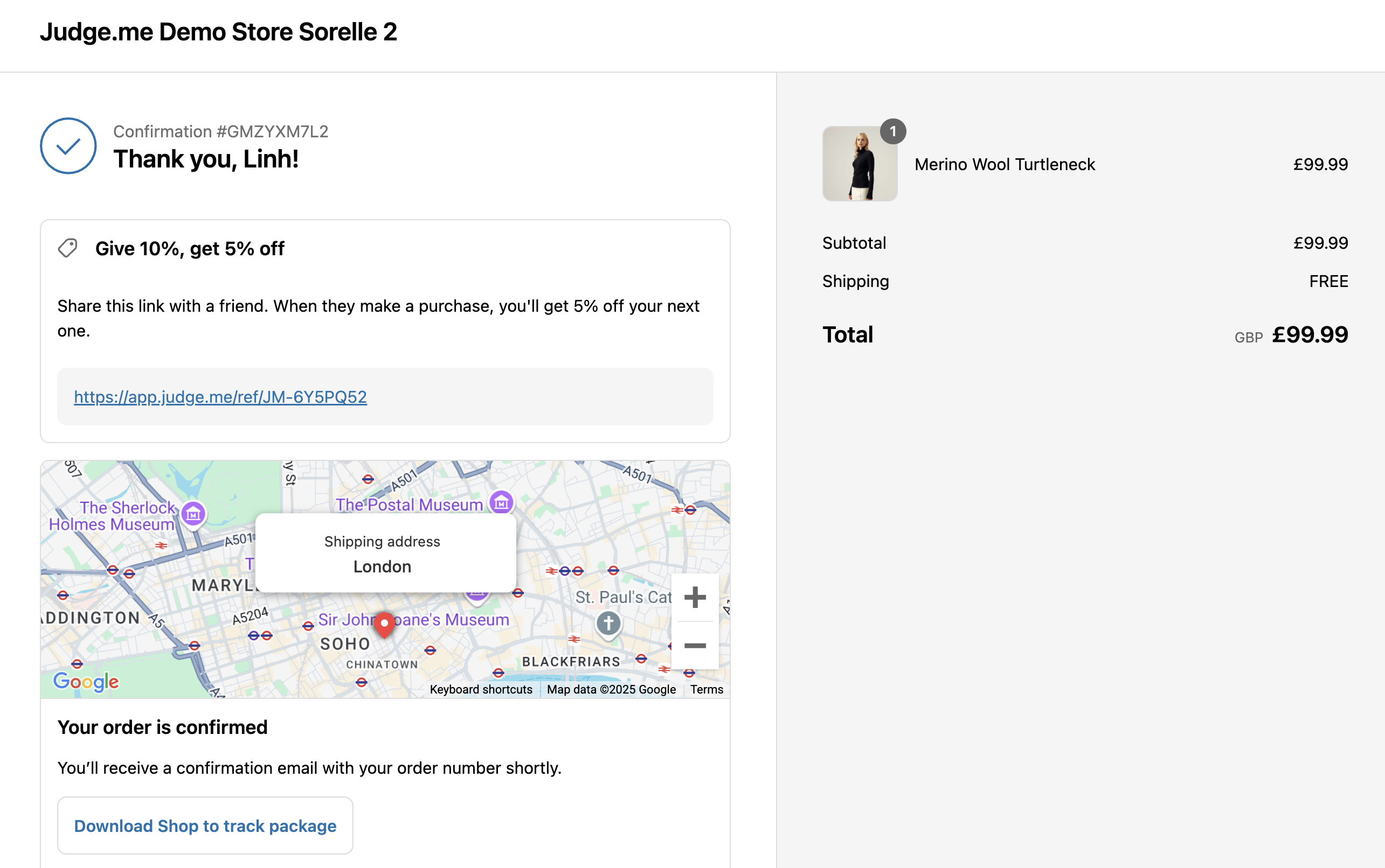 After a customer completes a purchase, a referral link is displayed on the Thank you page and the Order status page. Your customer can: