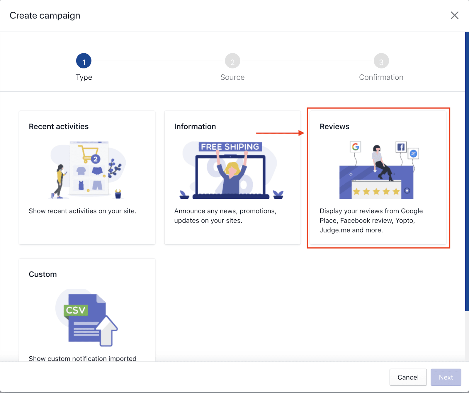 Create campaigns to showcase pop-up notifications of your latest Judge.me reviews on the storefront.
