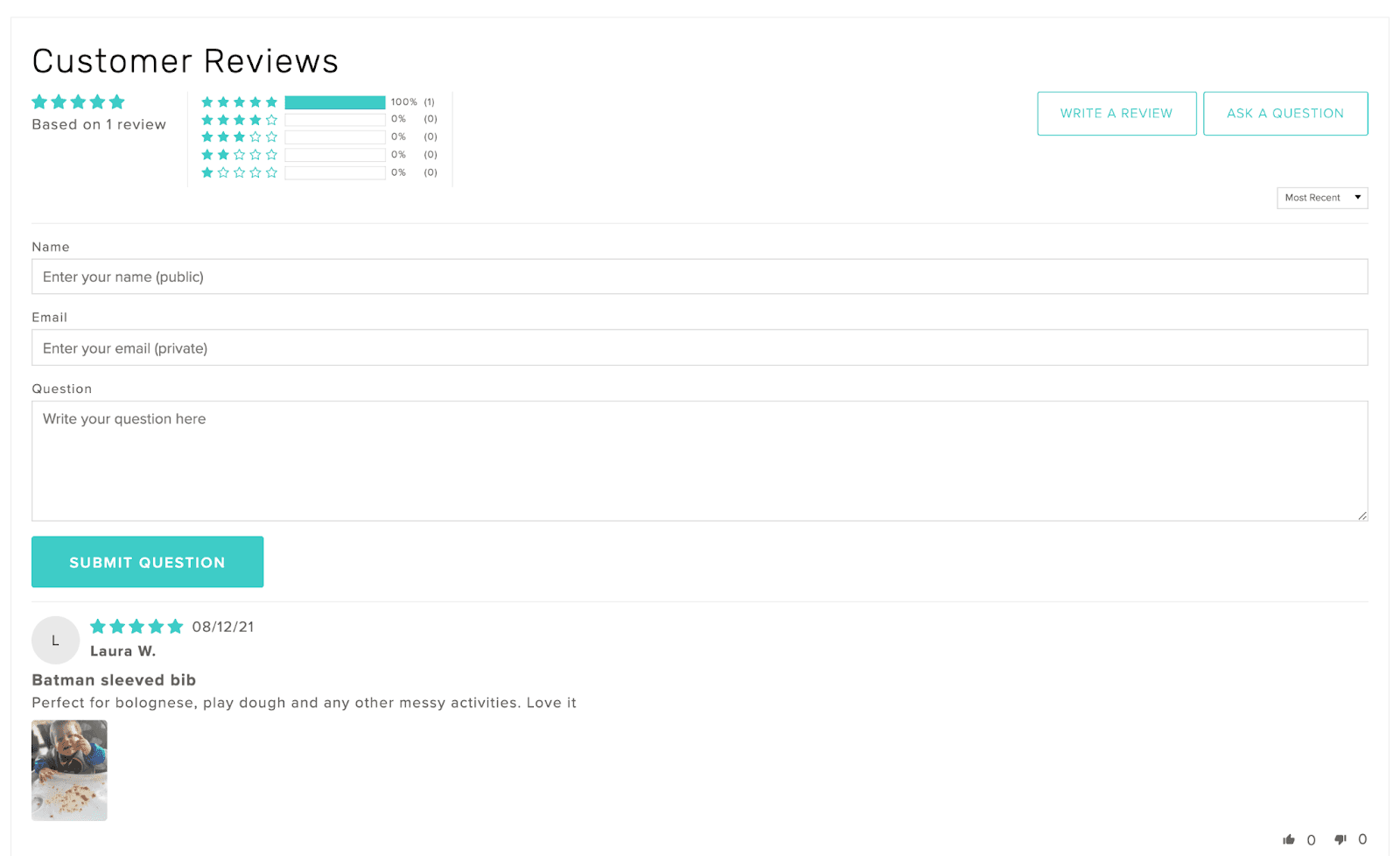 Jess also enabled the Questions & Answers so her customers can ask if they have any questions about the products, as well as a Floating Reviews Tab, which helps potential customers find all product and store reviews while visiting her store.