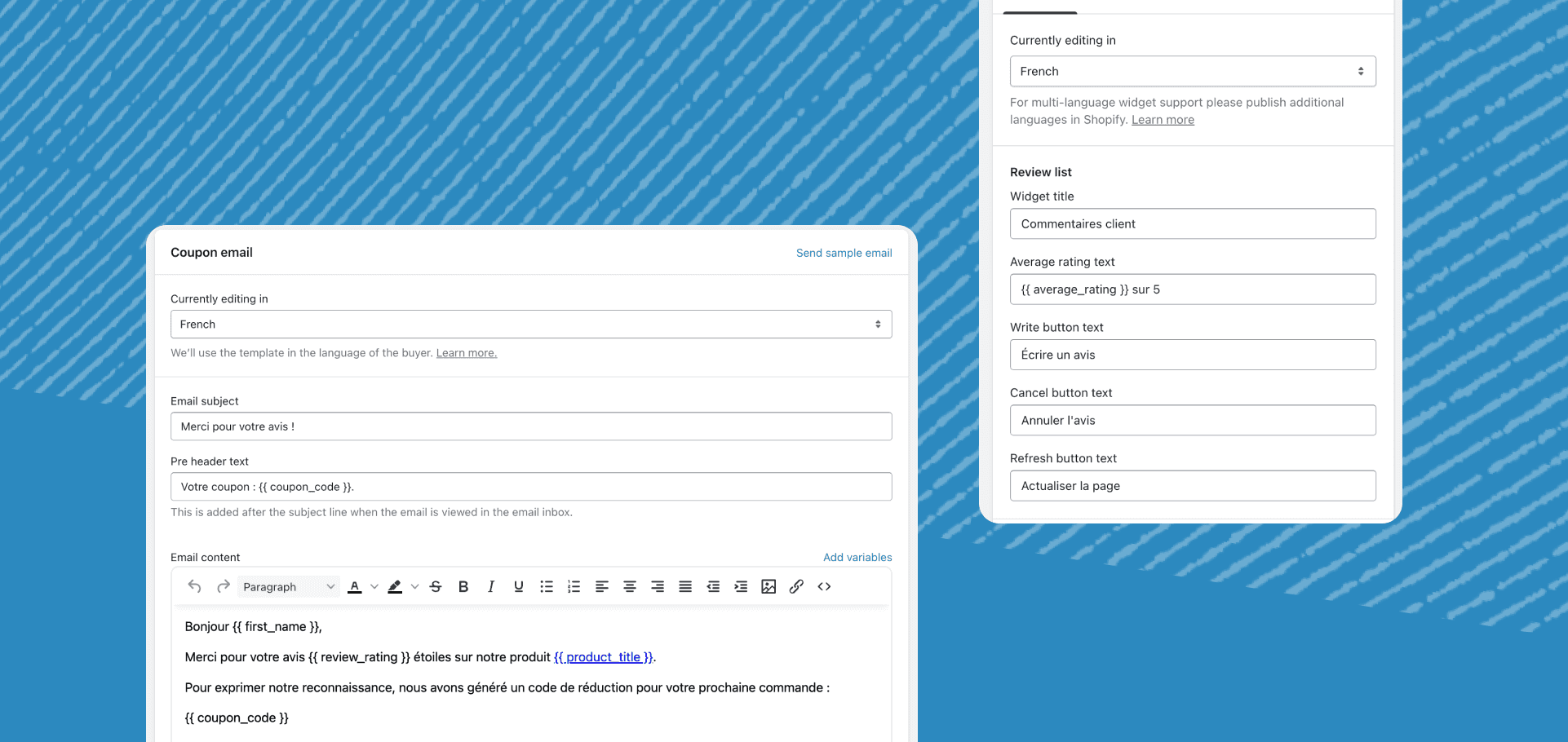 Whether your customers are browsing in French, Spanish, German, or any other supported language, they’ll see review widget text and receive emails they can actually understand.