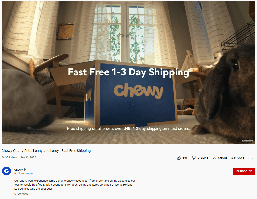 Chewy.com’s ads feature its simple yet catchy logo and packaging, emphasizing its no-frills aesthetic. The ads also give pets a voice, emphasizing how much both pets and humans love the convenience of its service.