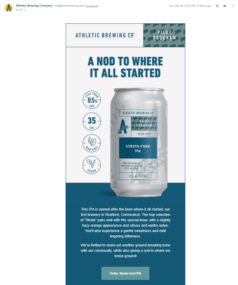 Athletic Brewing Co. produces and distributes non-alcoholic beer, which allows it to fill a distinct niche. The marketing email above gives the customer the first glance at one of its new products. Through email marketing, Athletic Brewing Co. builds customer loyalty and increases its products’ market exposure.