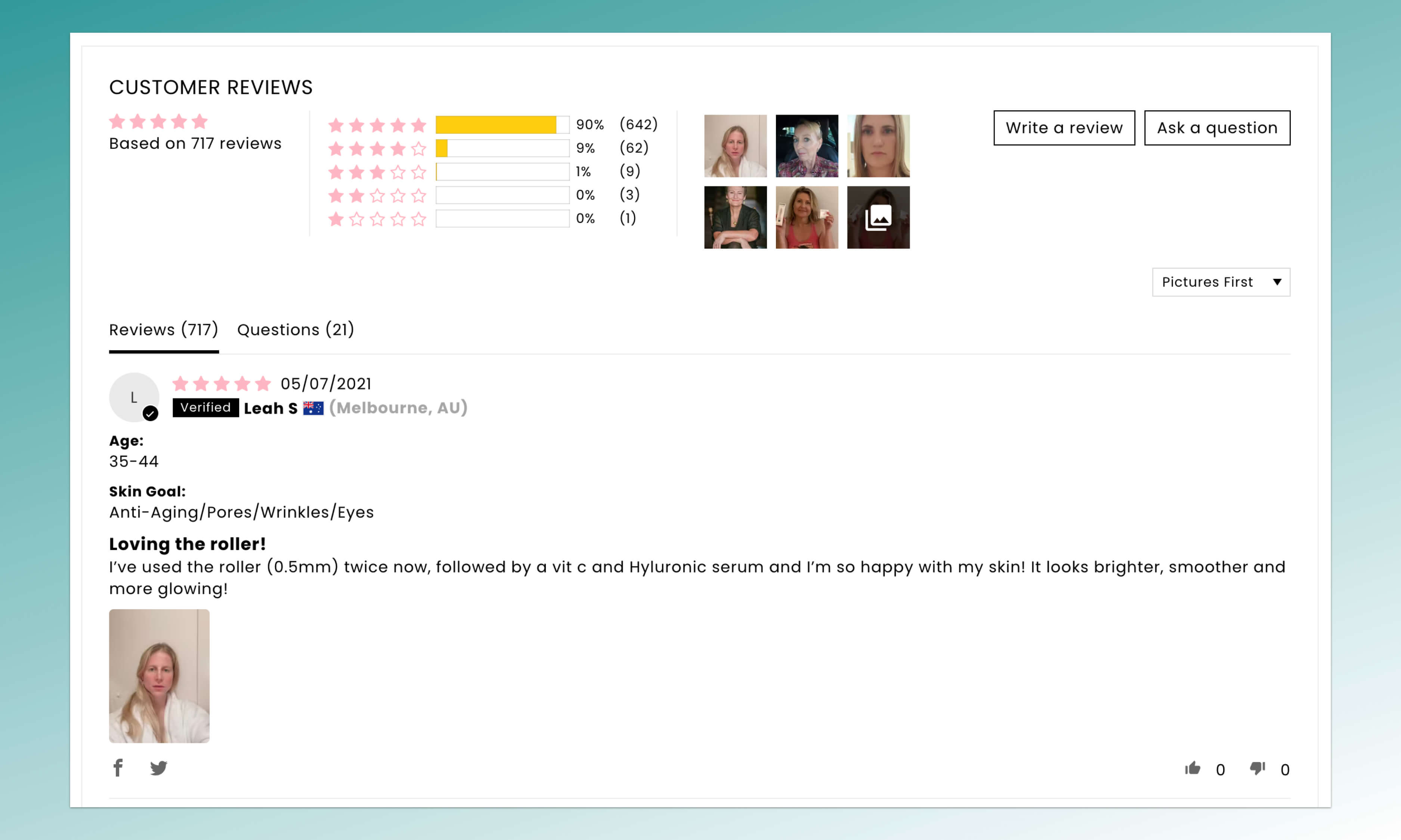 When it comes to the details within our reviews, we have chosen to customise the review form using the Custom Forms feature. This has allowed us to capture not only the star rating and review text but also more information about the customers, such as their age bracket and skin goal.