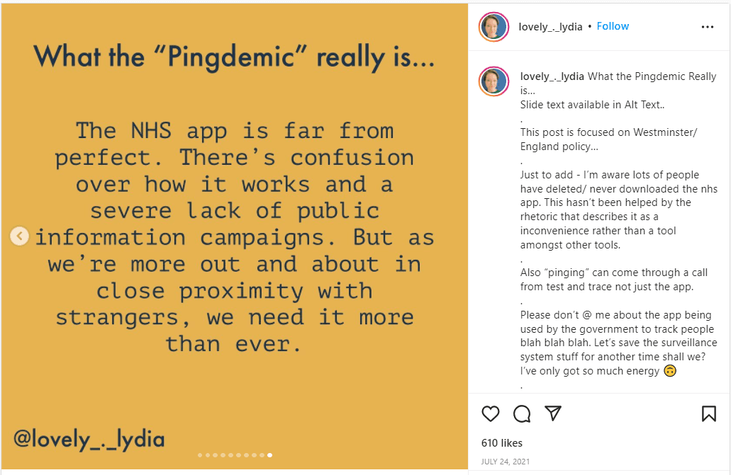 To reassure the public that the app was still necessary, the NHS engaged with influencers from all walks of life. Political influencer Lydia Finney, for example, created an Instagram post about the NHS app and why it was still necessary despite its technical limitations.