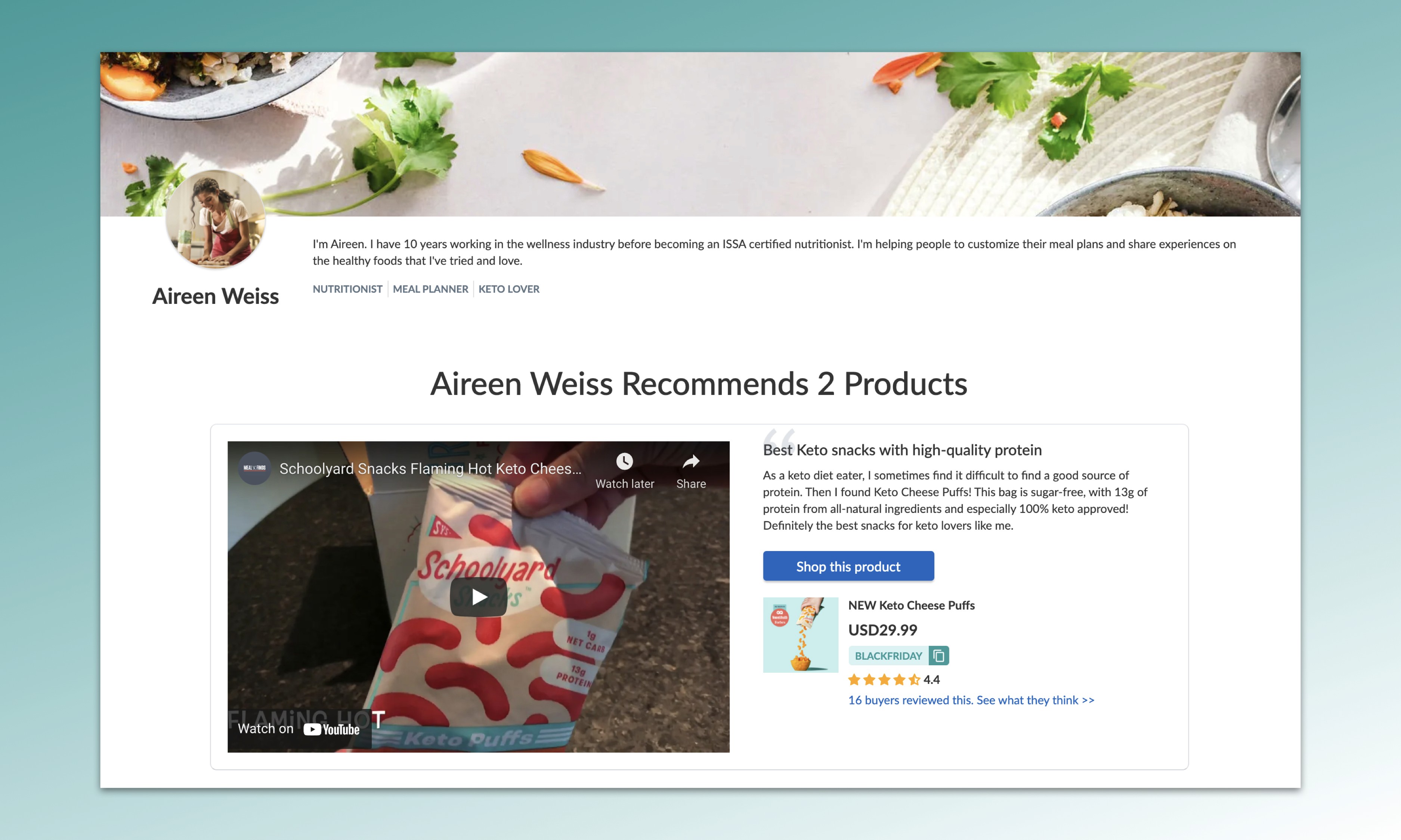 Besides showcasing your social proof, Judge.me Recommendations page also helps you attract more sales. If you have an affiliate or reward program, you can ask influencers to add your affiliate links or coupon codes to their recommendations on Judge.me. After reading the product recommendations, potential customers can click on the call-to-actions (CTA) button to go to your store and make a purchase immediately. Such shoppable UGC is increasingly used by brands as a way to simplify and smoothen the buying journey, ensuring that customers are only one or two clicks away from getting their desired products.