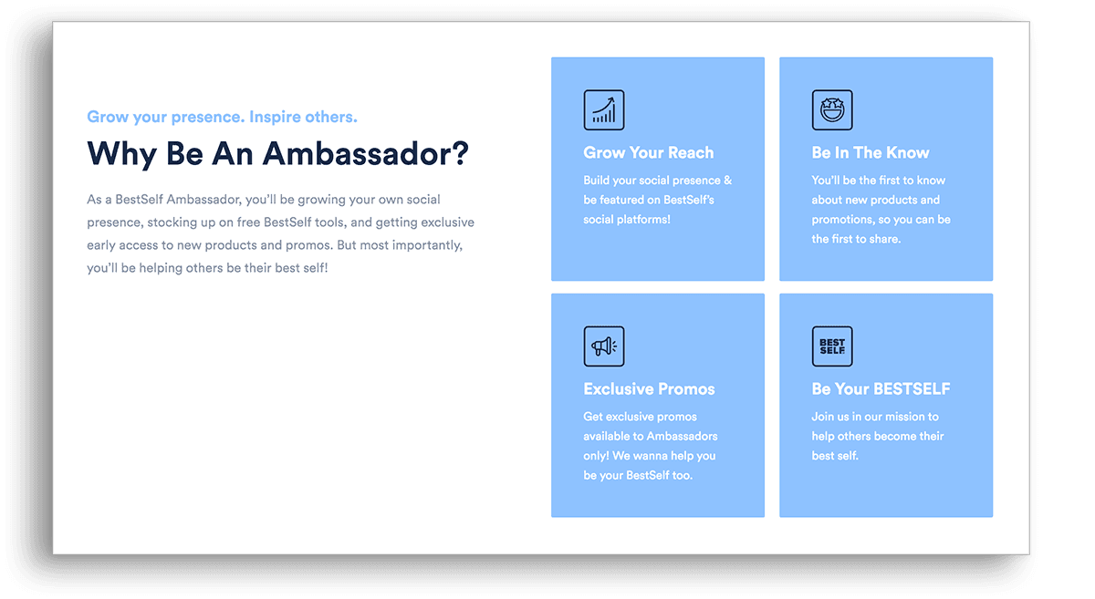 Best Self Co. builds loyalty among customers with an ambassador program, now 2500+ members strong. Customers who do brand building using their social media accounts are awarded points to be redeemed against BestSelf products. “We leverage their audiences for product launches, and incorporate them into building the brand and being our voice outside of our own company for ads and messaging,” Jess says.