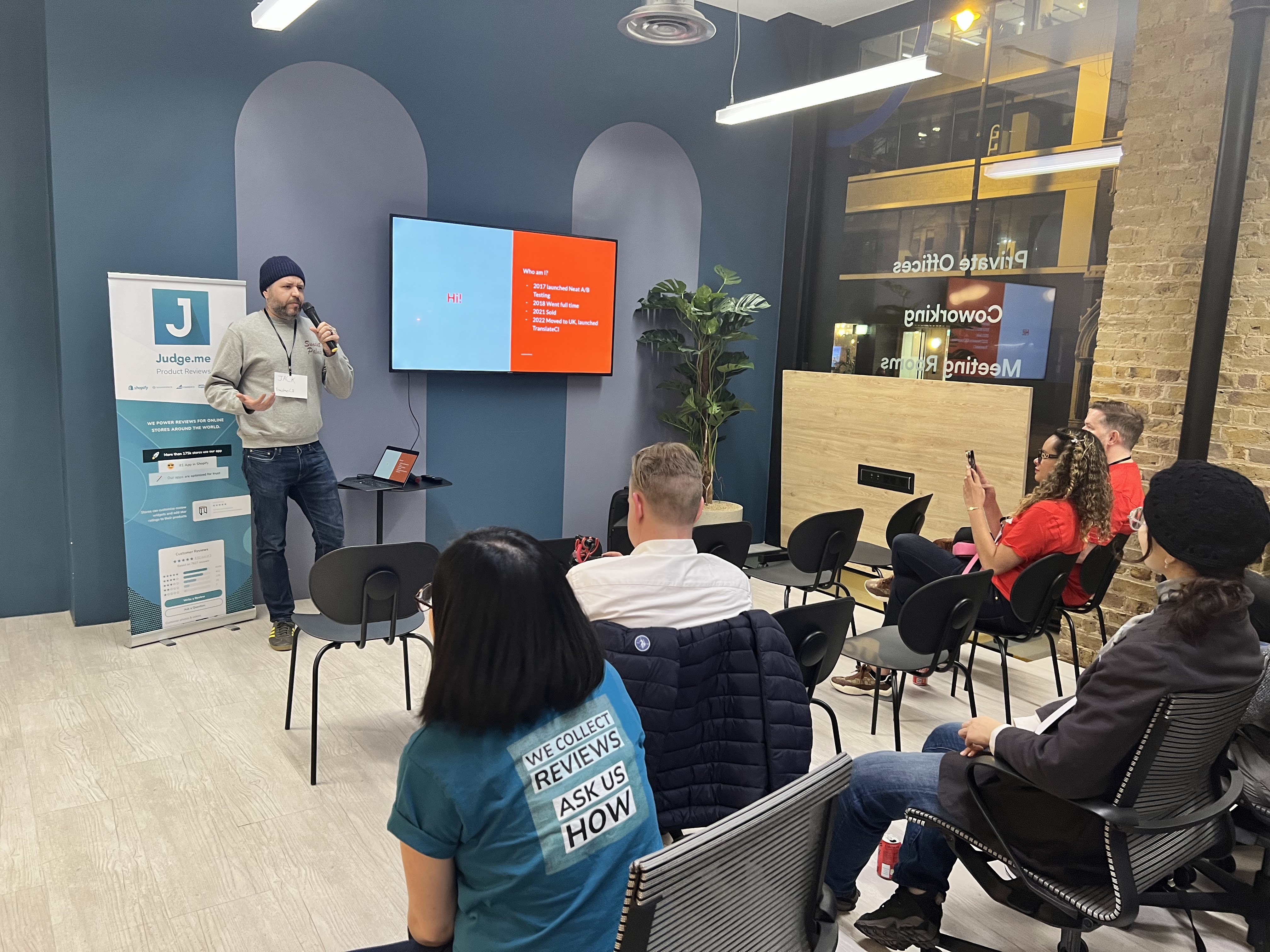 On January 24, we host the Shopify Tech Partners Meetup at our office at Work.Life Old Street, London. We were excited to meet with so many members of the ecommerce community from all over the UK. We said a few things about how we got to the top of Shopify’s App Store, and glad to have Jack at Translate CI joining us to talk about how merchants can grow their stores in underserved markets.