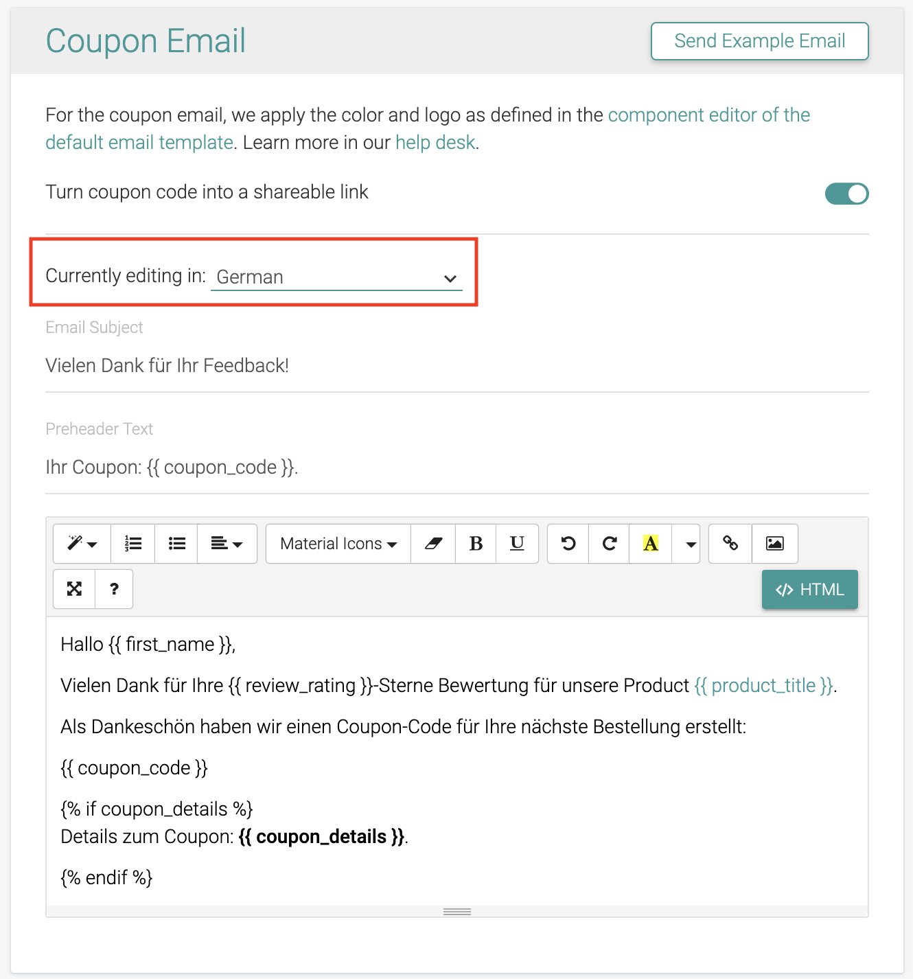 In Coupon Email settings, choose the language you want to edit from the drop-down menu