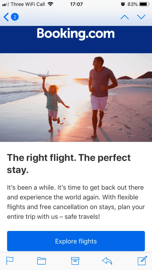 Booking.com, a travel site, does an excellent job with their mobile email design as well. They focus on short messaging and clear imagery, with a very prominent call to action to encourage users to book their travel plans.
