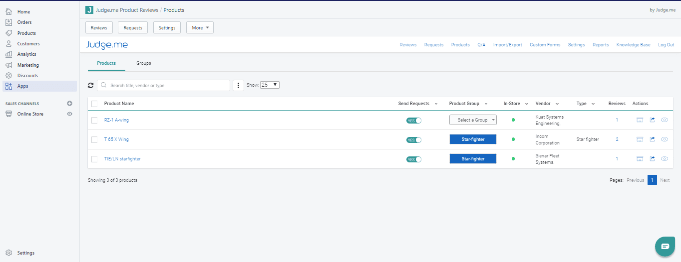 For example, if you want to share reviews across all your fridge magnets, you can go to Type at the top of the table and filter for only “fridge-magnet” products appear. Then, you can select all of these products with a single click and do a bulk update to add them to the same product group at once. You can also use a similar method to easily configure which products you want to include or exclude when Judge.me automatically sends out review requests.