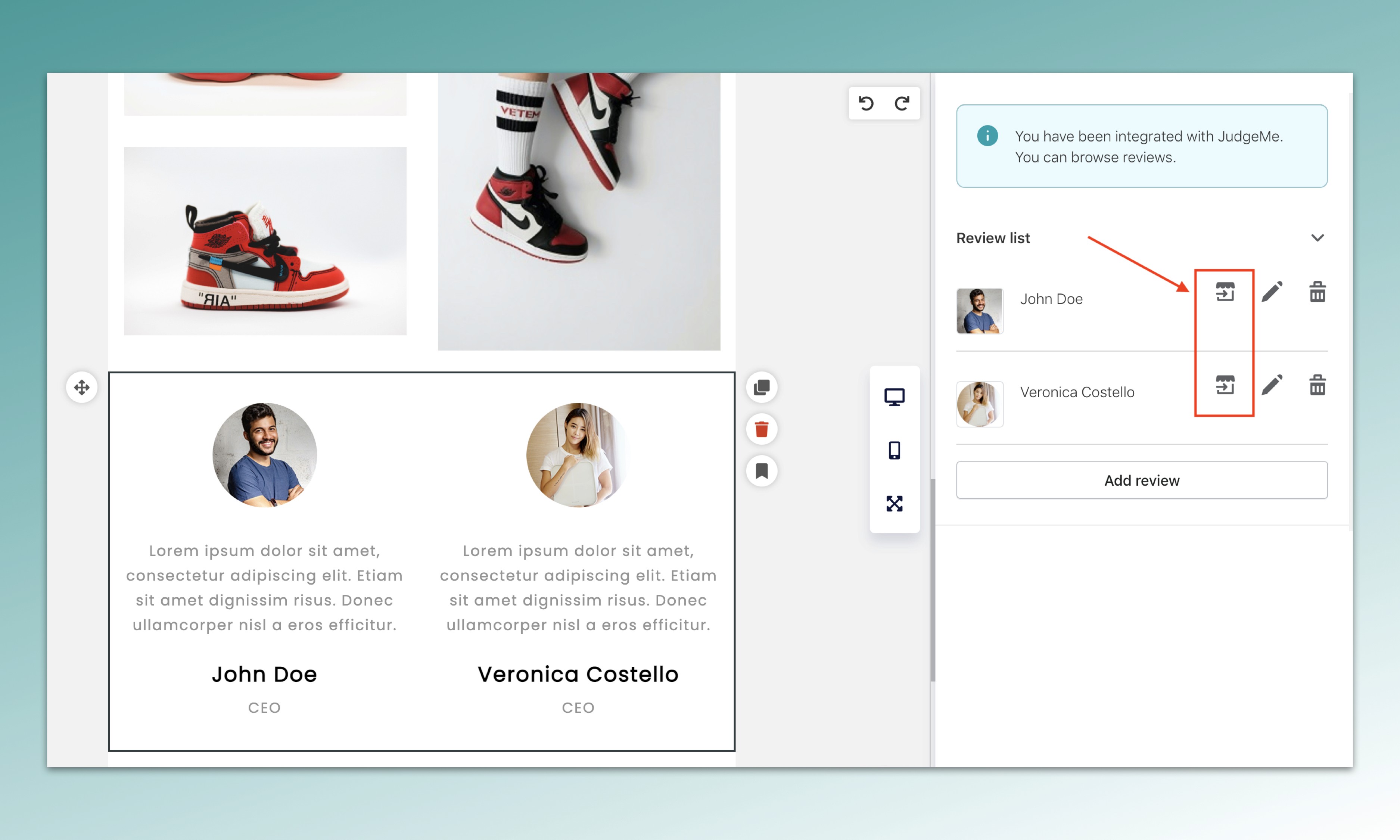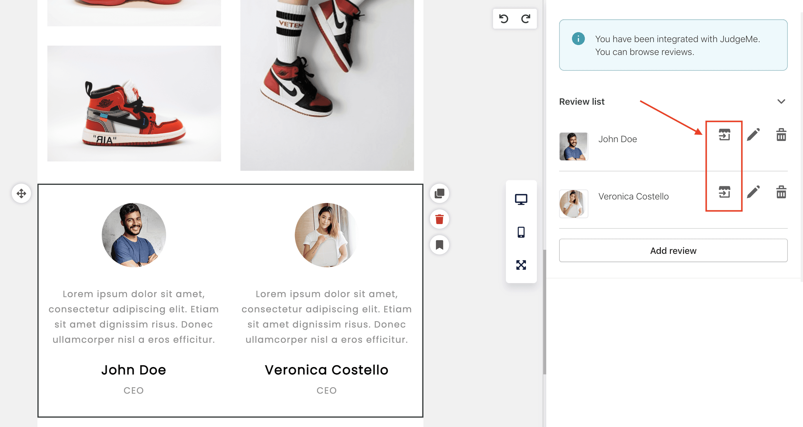 Testimonial 1: display review content from Judge.me and icon image