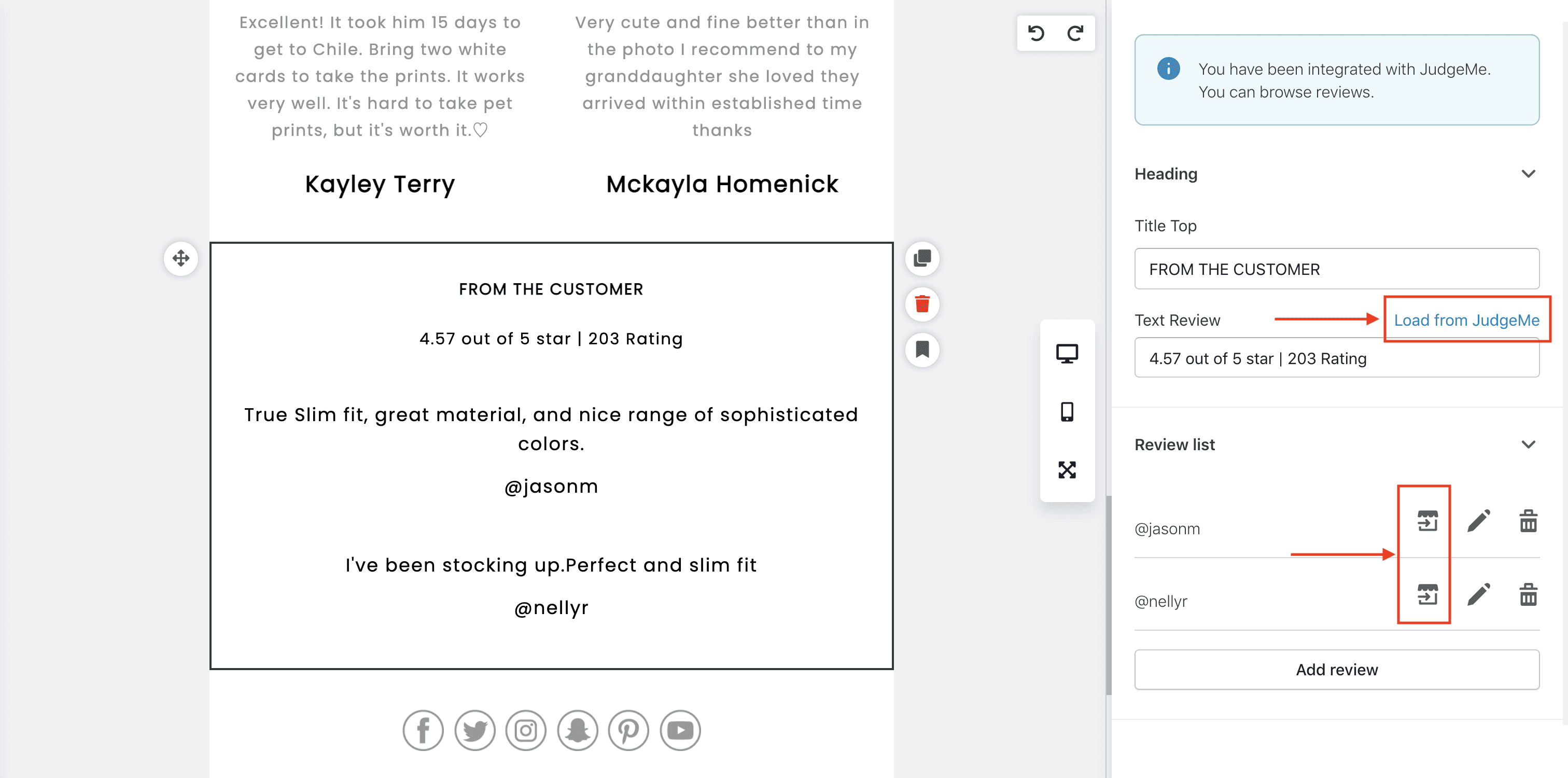 Display Judge.me reviews and average ratings in testimonial blocks of email campaigns