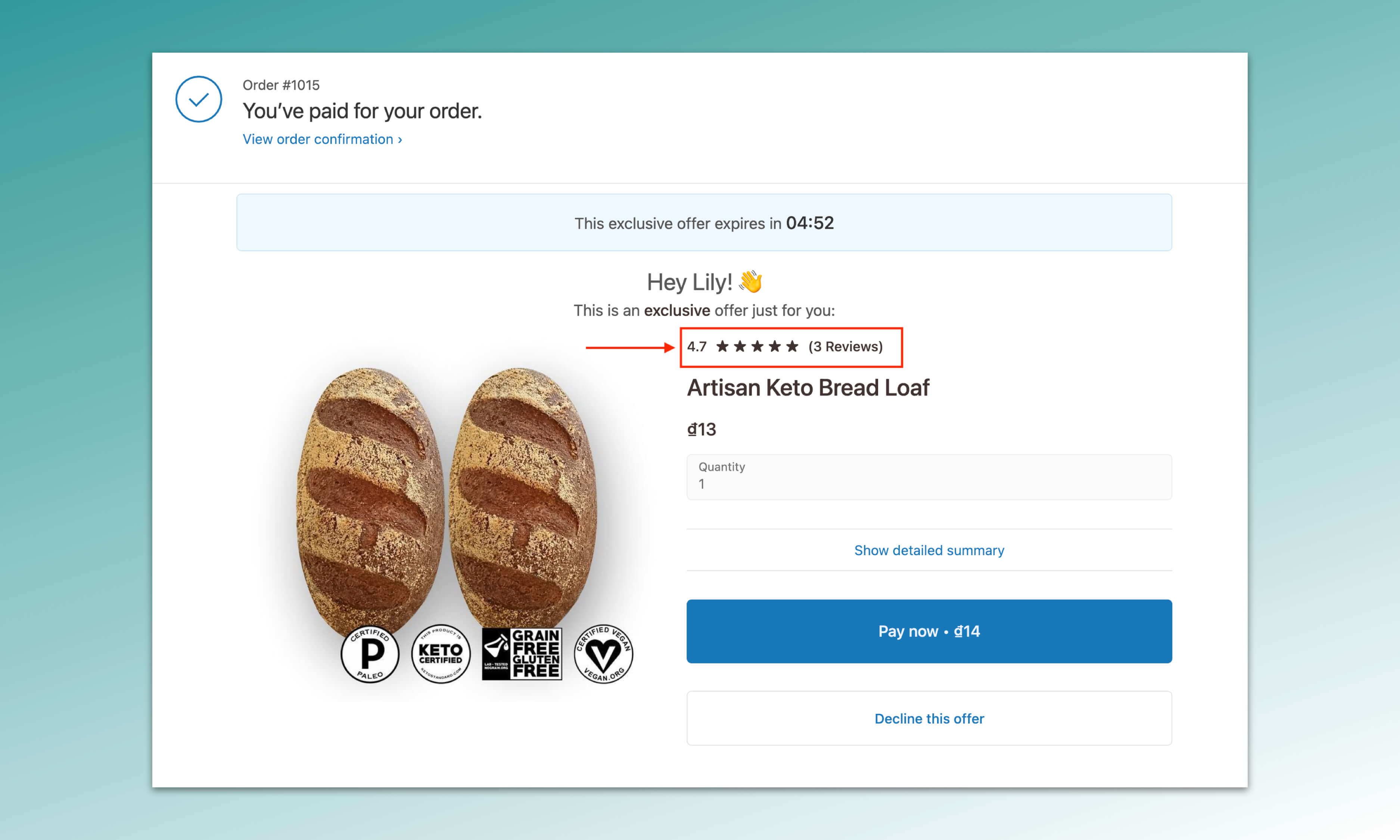 Displaying special offers at checkout can help you gain extra purchases, especially if the promoted products are highly reviewed.