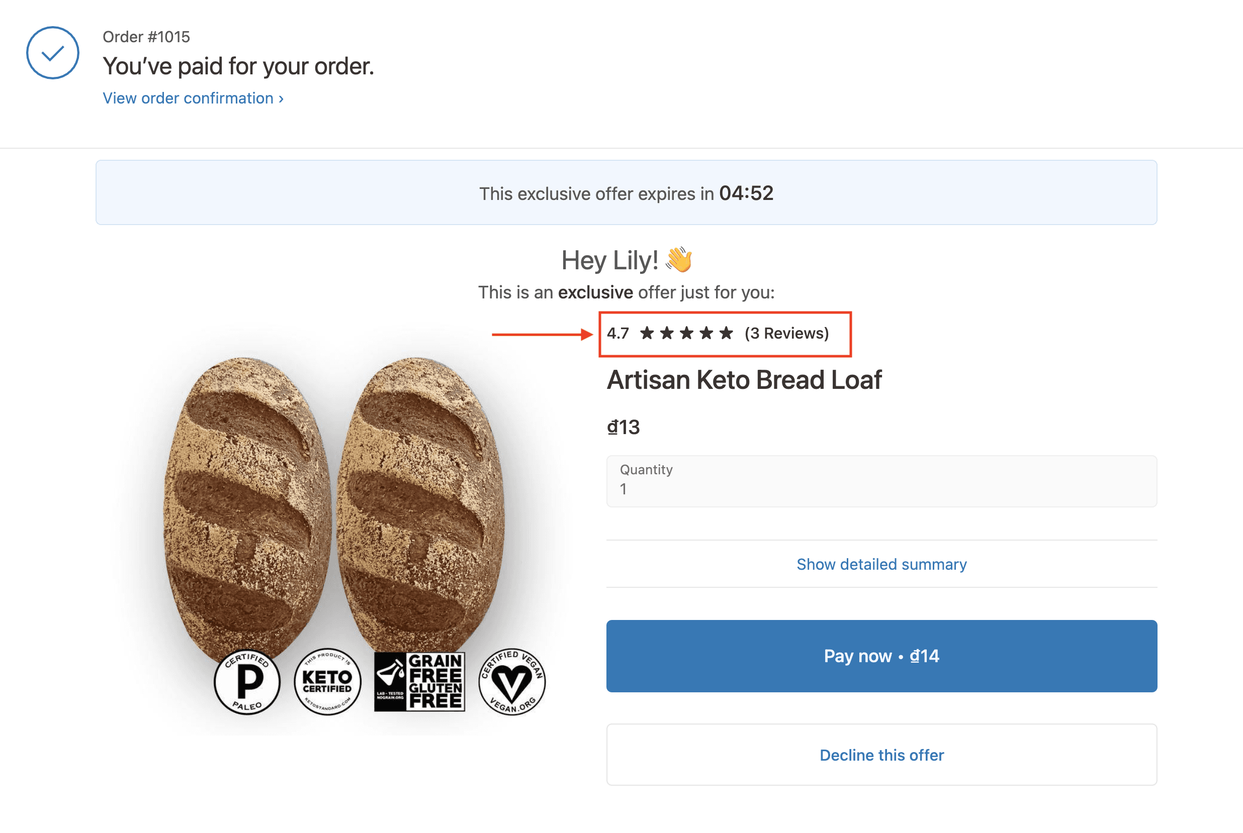 With Checkout Promotions & Upsells <> Judge.me integration, you can display your Preview Badge (star ratings) and review count on your post-purchase offers. This adds more social proof to your offer and encourages your customers to buy more.
