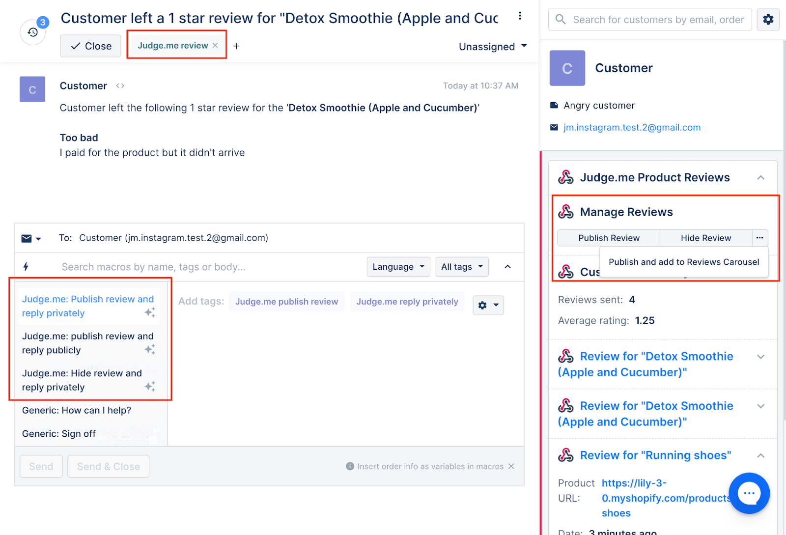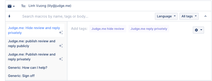 Hide review and reply privately: this macro will hide the review in Judge.me and let you send a reply from Gorgias to the customer's email.