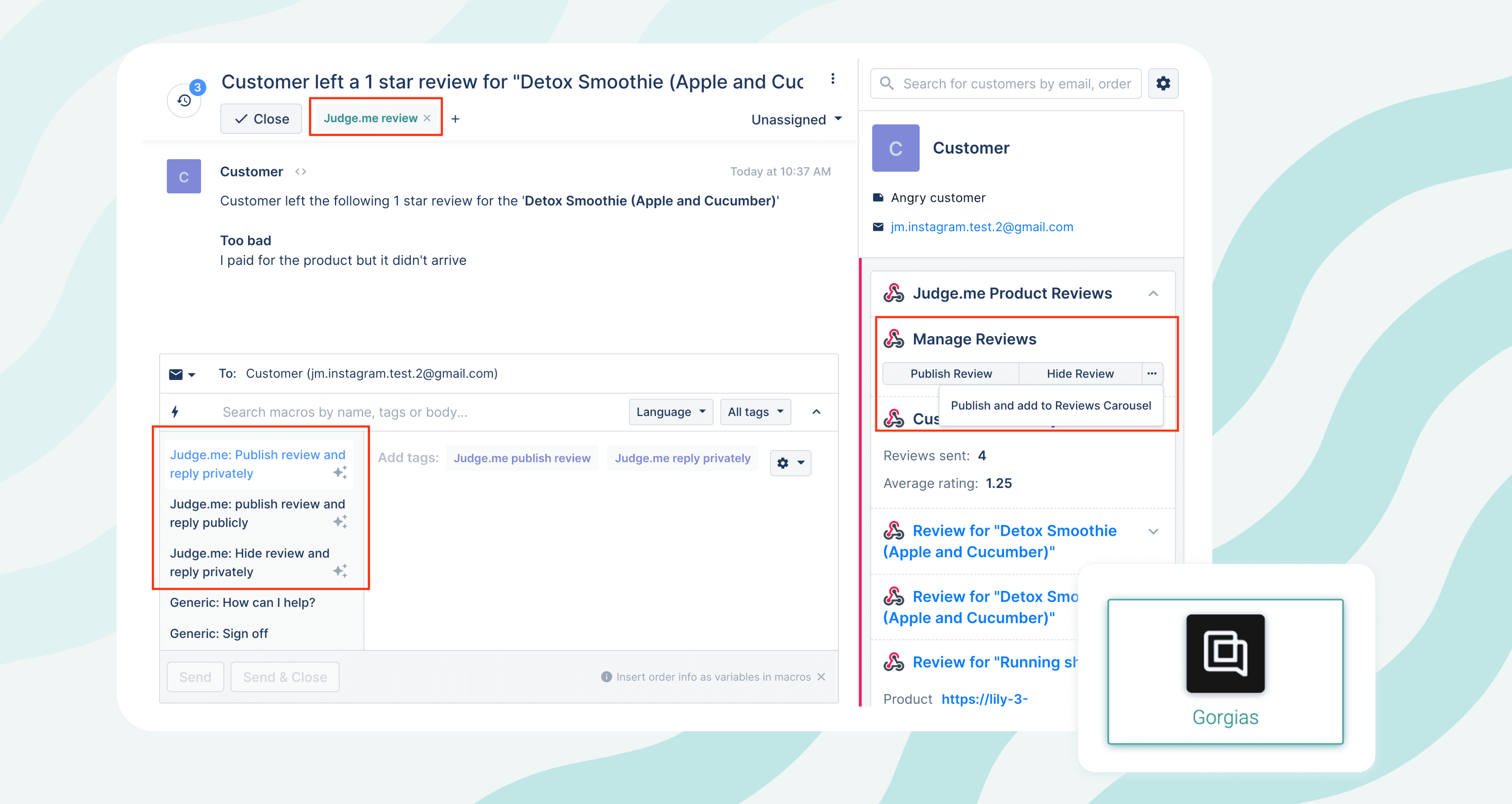 Need to reply to your reviewers? You can publish (hide) the reviews and reply to them with one single action using Gorgias’s macros built by Judge.me. You have 3 macros to resolve this ticket in Gorgias: