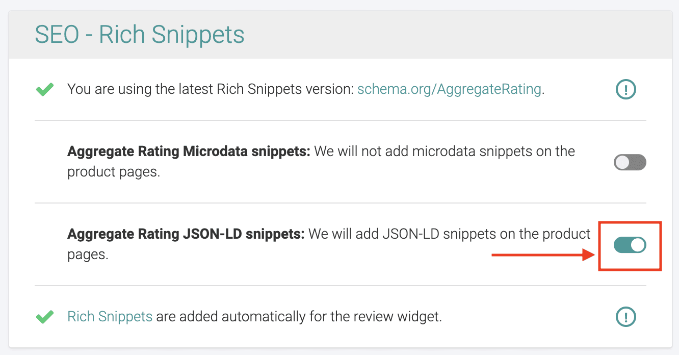 Enable JSON-LD snippets in Judge.me Settings > Advanced > Rich Snippets > SEO - Rich Snippets.