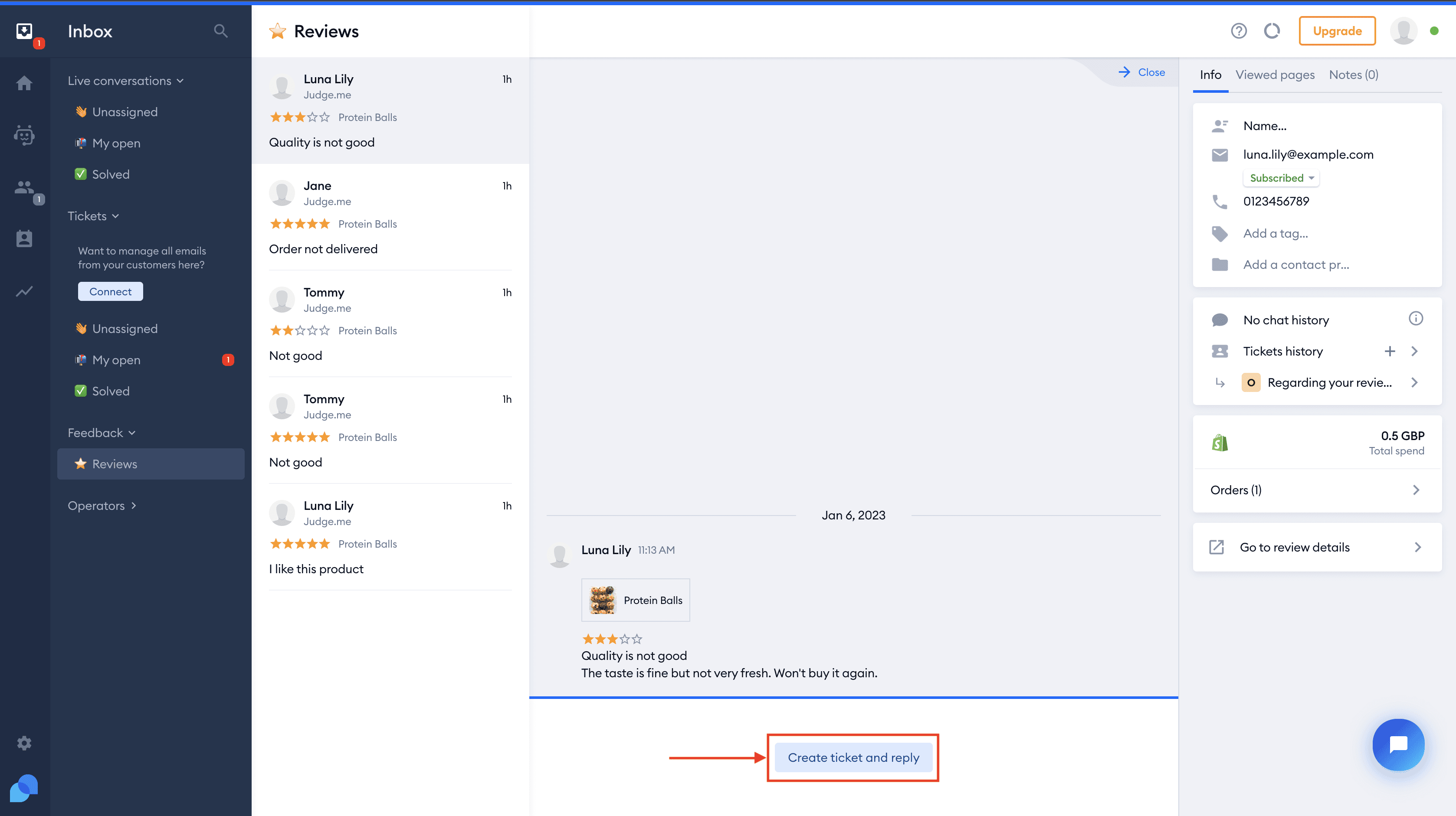 This integration also allows you to sync all reviews you receive from Judge.me, so you can manage them easier with your customer support tools. When customers submit reviews in Judge.me, your reviews will appear in Tidio's inbox. You can see the star rating and review content, as well as customer information linked with those reviews on the right panel. From the inbox, you can create a support ticket, include internal notes and reply to your customers easily.