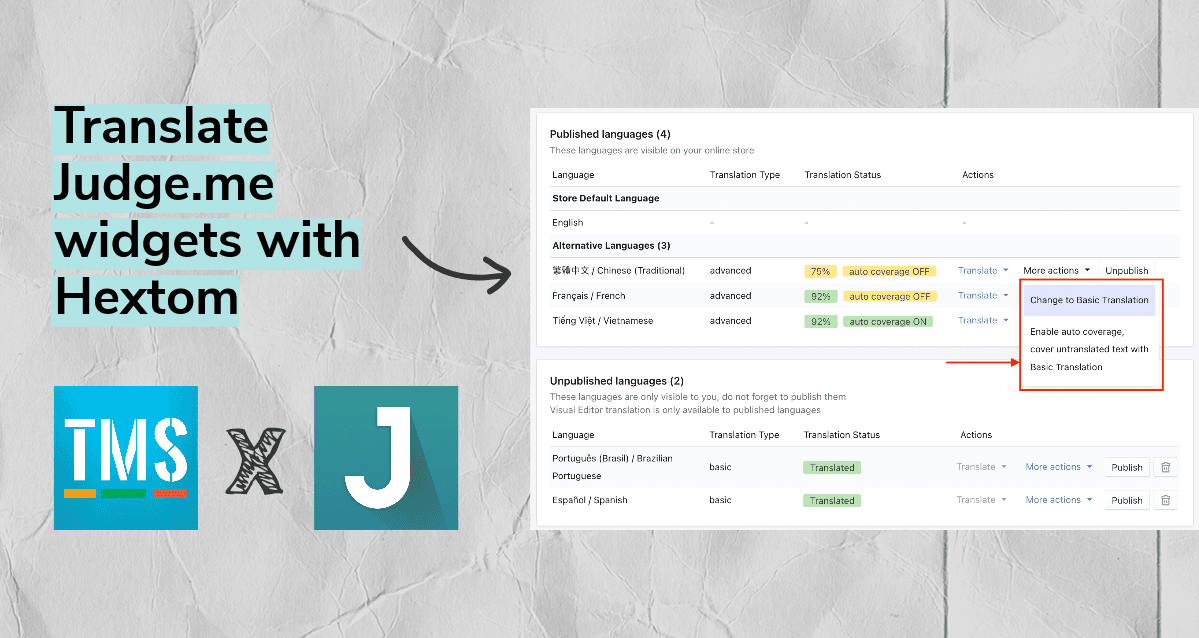 Now, thanks to our new integration with Hextom: Translate My Store, you can change your Judge.me widgets into more than 130 languages with just a few clicks, providing shoppers with a fully localized shopping experinece.