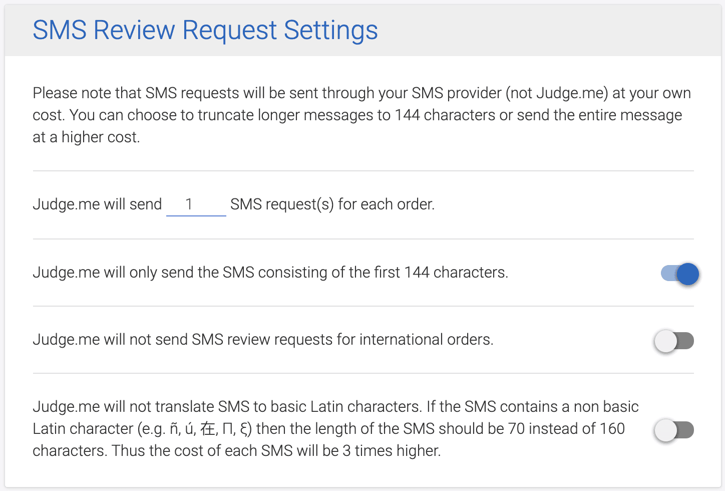 Judge.me - SMS Notifications integration can be enabled easily by pasting the Licence Key from SMS Notifications settings to Judge.me Integrations settings. Then, you can make further configurations of the SMS templates and request schedules directly from Judge.me Review Request settings. Check our help desk article for step-by-step instructions on how to enable this integration.