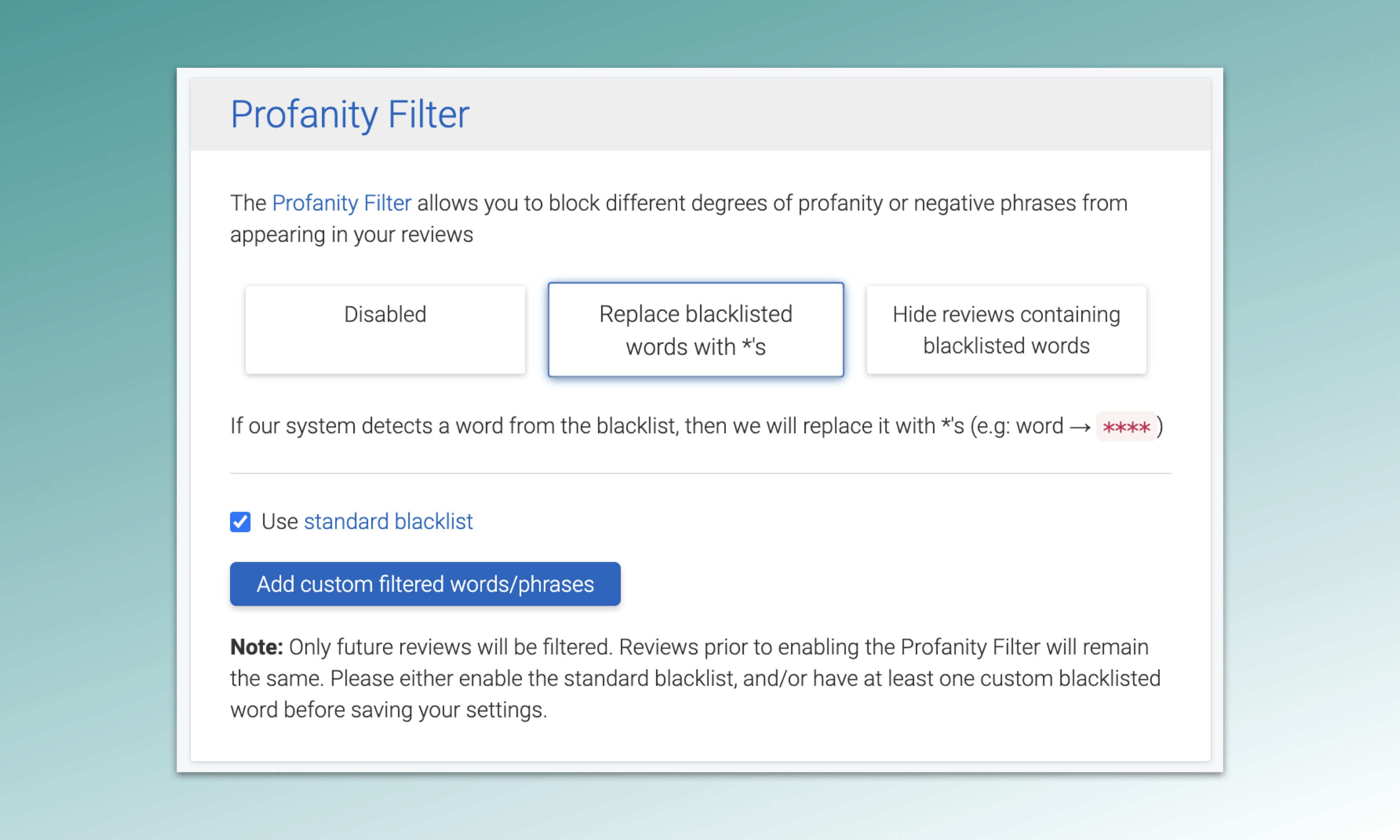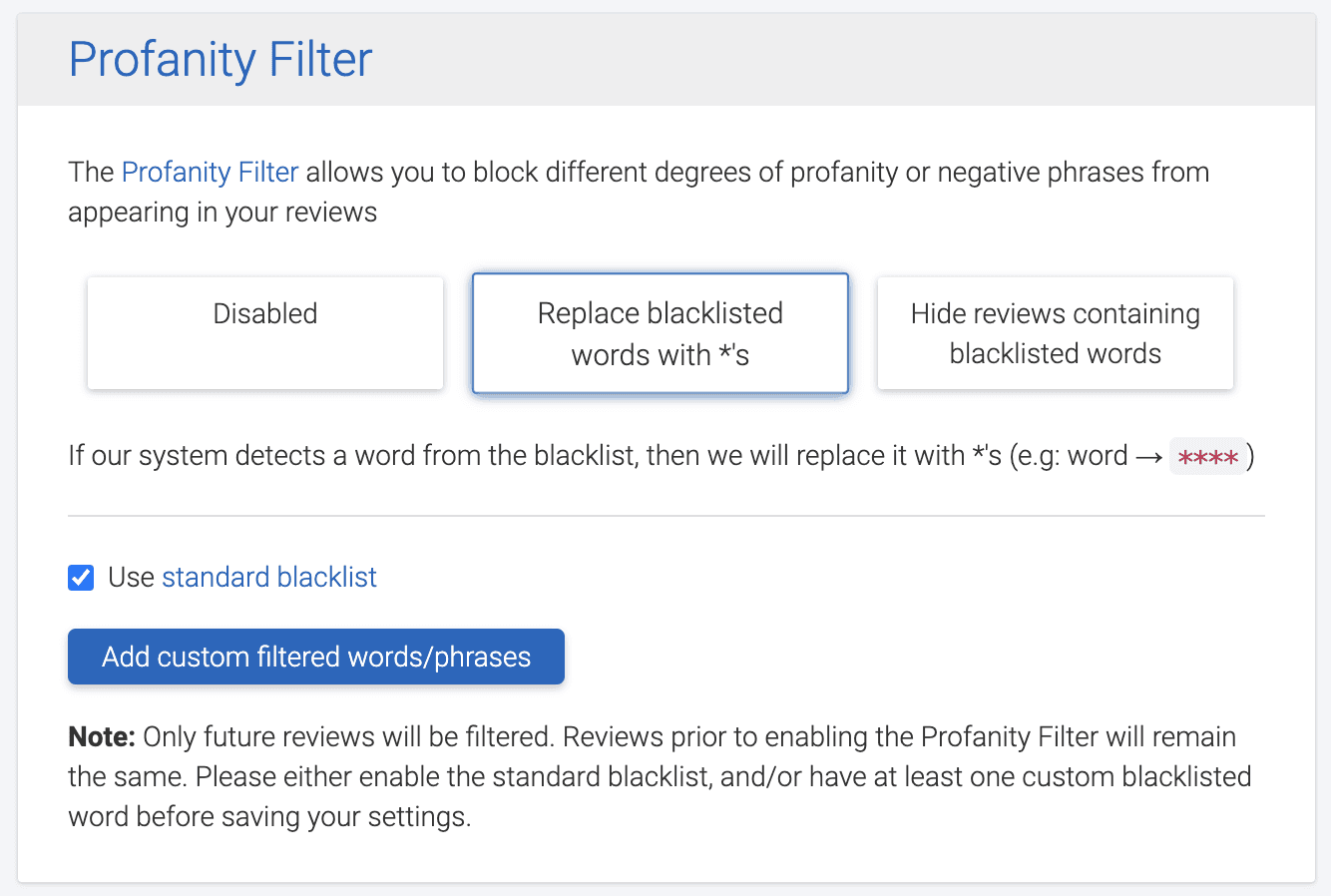 When you choose this option, our system will replace blacklisted words in your reviews with a string of [*]. For example, [profanity] will become [****]. This will ensure no profanity appears in your reviews, especially if you are activating the auto-publish feature and unaware of the accidental publication.