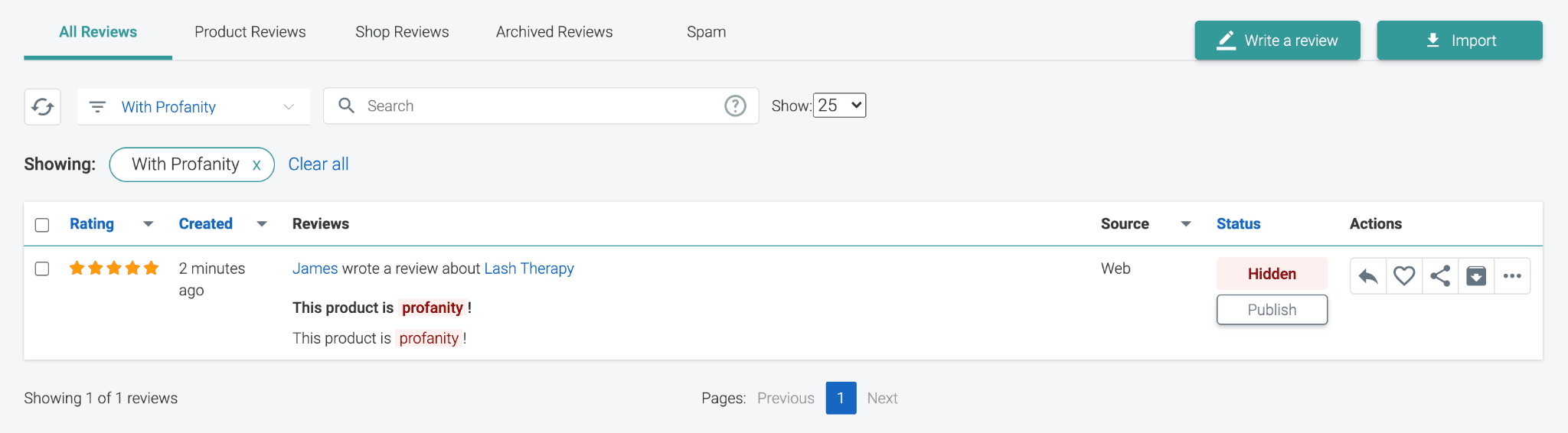 You can see all filtered reviews in the Reviews Dashboard by applying the "With Profanity" filter. In each review, the “improper words” will be highlighted in red. We recommend you check this filter occasionally to see if some good reviews (but containing blacklisted words) are accidentally hidden. In this case, you can simply re-publish the reviews.