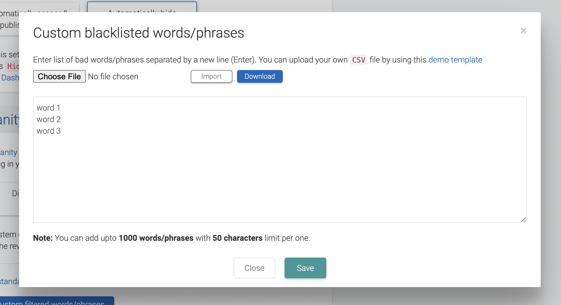 Judge.me provides a standard list of blacklisted words to help you filter your reviews. You can also add your own filtered words/phrases. Your custom words will be used along with our standard list. Follow these guidelines to set up your blacklisted words in the Profanity Filter.