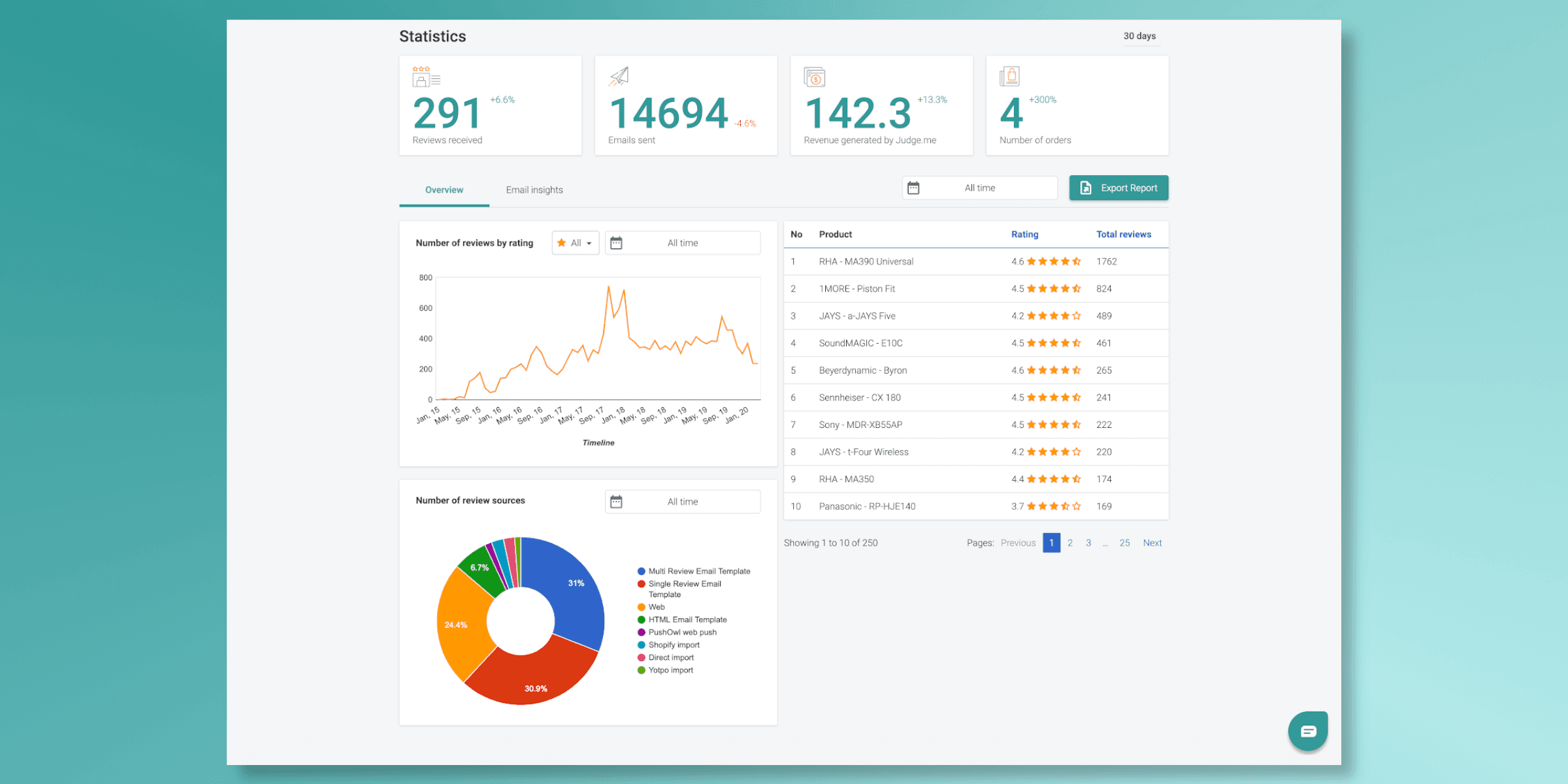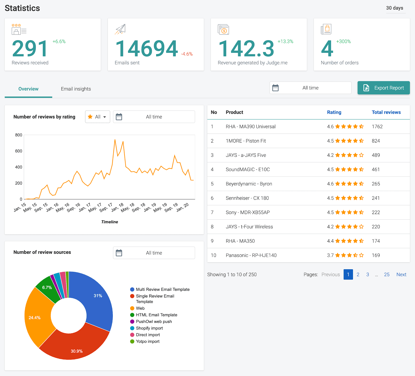 Number of reviews by source: lets you know which sources are attracting the most reviews (web, email templates, import)